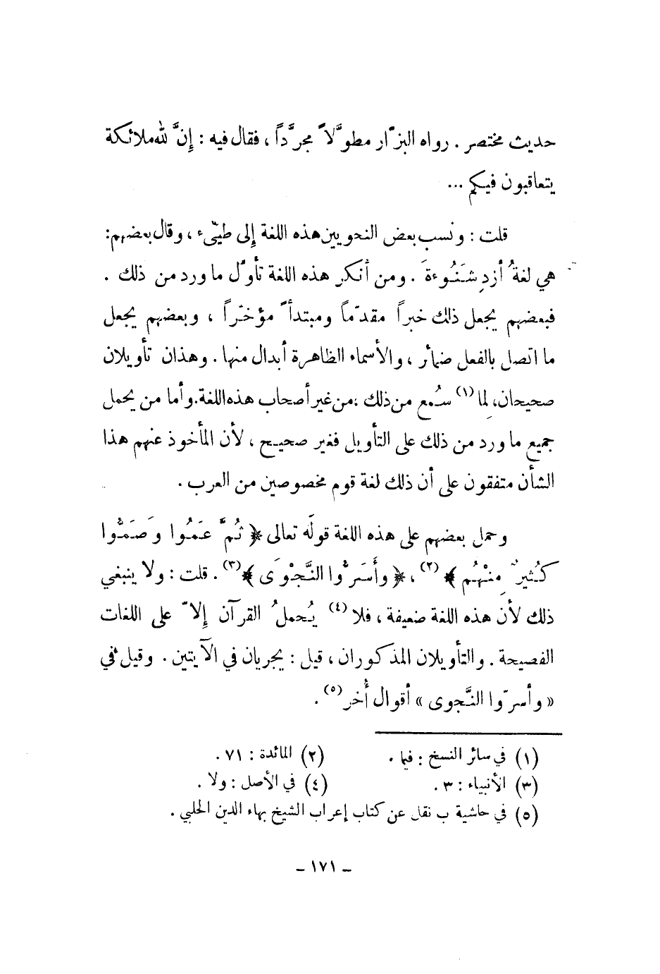 وحمل بعضهم على هذه اللغة قوله تعالى " ثم عموا وصموا كثير منهم "، " وأسروا النجوى ". قلت: ولا ينبغي ذلك لأن هذه اللغة ضعيفة، فلا يحمل القرآن إلا على اللغات الفصيحة. والتأويلان المذكوران، قيل: يجريان في الآيتين. وقيل في وأسروا النجوى أقوال أخر.