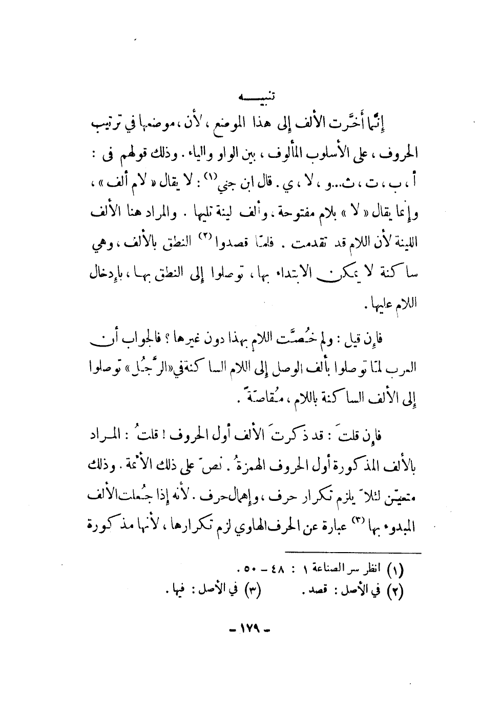 إنما أخرت الألف إلى هذا الموضع، لأن، موضعها في ترتيب الحروف، على الأسلوب المألوف، بين الواو