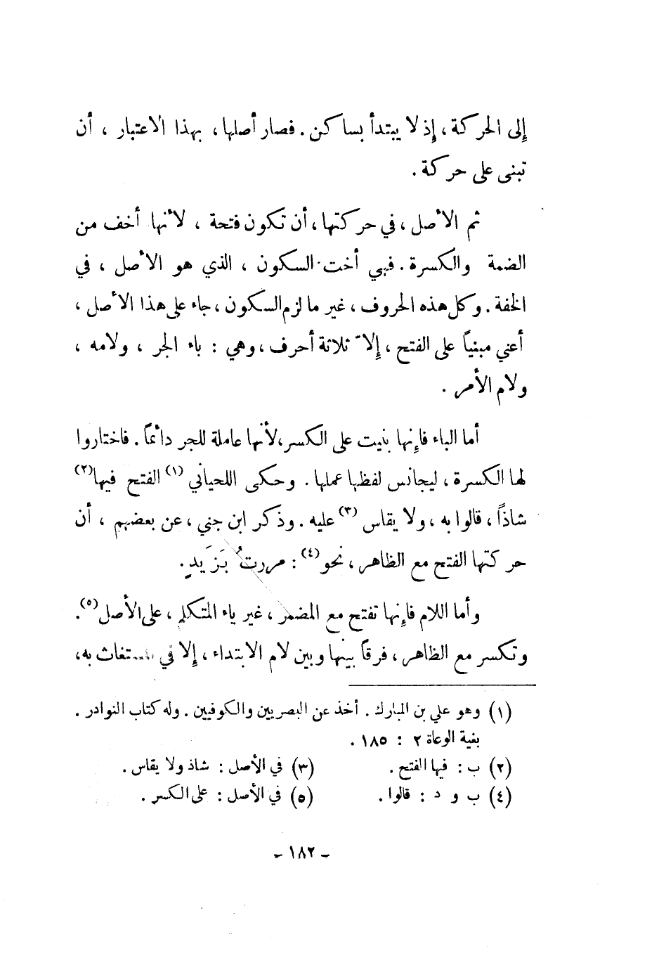 ثم الأصل، في حركتها، أن تكون فتحة، لأنها أخف من الضمة والكسرة. فهي أخت السكون، الذي هو الأصل، في الخفة. وكل هذه الحروف، غير ما لزم السكون، جاء على هذا الأصل، أعني مبنياً على الفتح، إلا ثلاثة أحرف، وهي: باء الجر، ولامه، ولام الأمر.