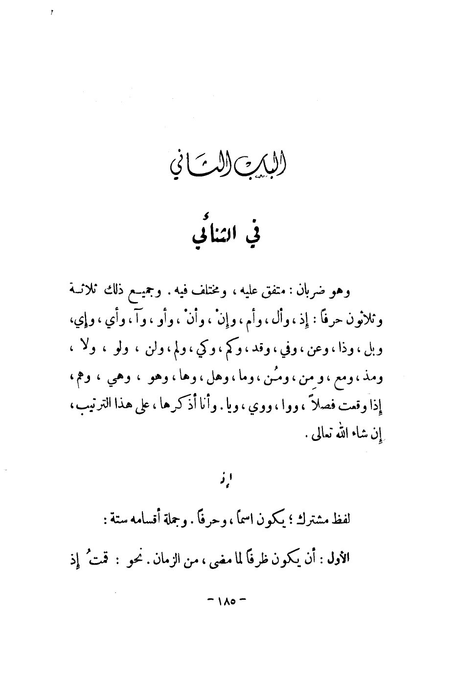 وهو ضربان: متفق عليه، ومختلف فيه. وجميع ذلك ثلاثة وثلاثون حرفاً: إذ، وأل، وأم، وإن، وأن، وأو، وآ، وأي، وإي، وبل، وذا، وعن، وفي، وقد، وكم، وكي، ولم، ولن، ولو، ولا، ومذ، ومع، ومن، ومن، وما، وهل، ومها، وهو، وهي، وهم، إذا وقعت فصلاً، ووا، ووي، ويا. وأنا أذكرها، على هذا الترتيب، إن شاء الله تعالى.