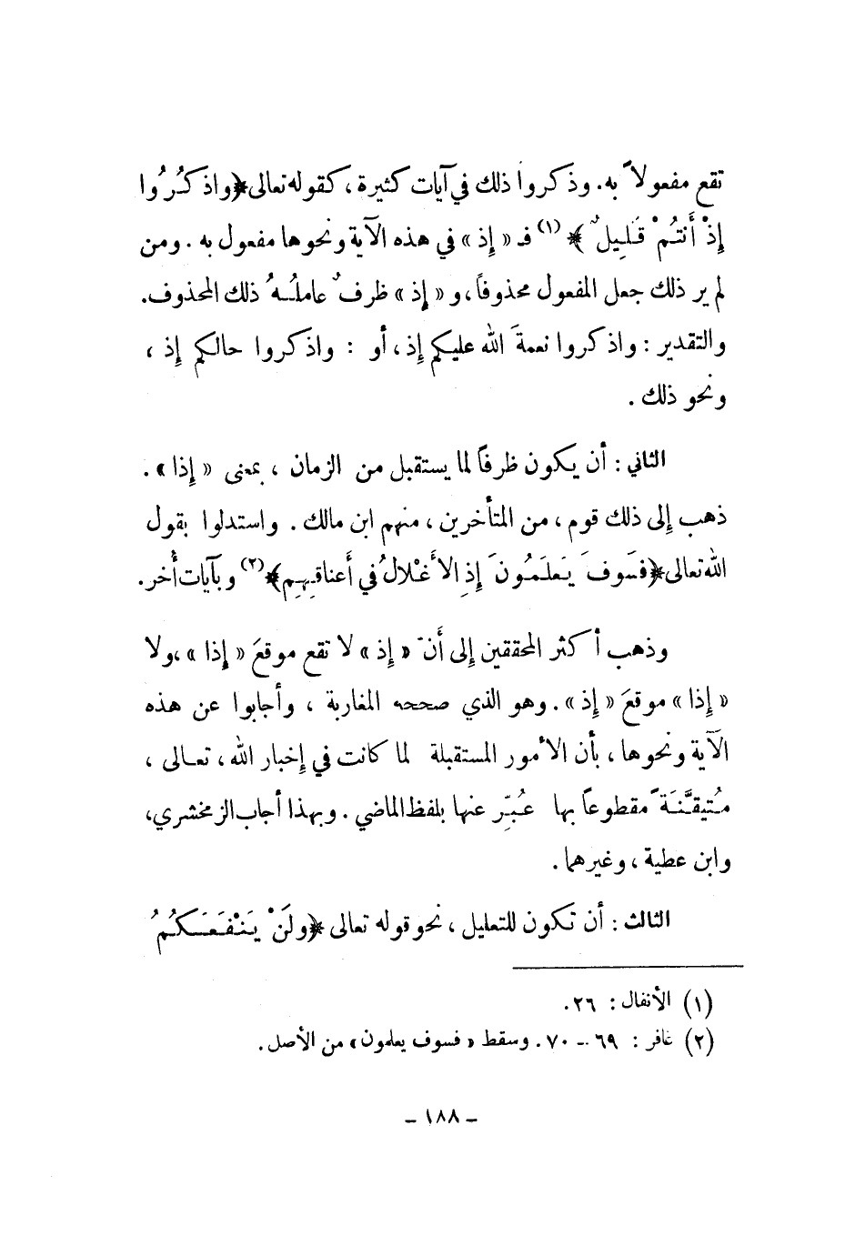 وذهب أكثر المحققين إلى أن إذ لا تقع موقع إذا، ولا إذا موقع إذ. وهو الذي صححه المغاربة، وأجابوا عن هذه الآية ونحوها، بأن الأمور المستقبلة لما كانت في إخبار الله، تعالى، متيقنة مقطوعاً بها عبر عنها بلفظ الماضي. وبهذا أجاب الزمخشري، وابن عطية، وغيرهما.