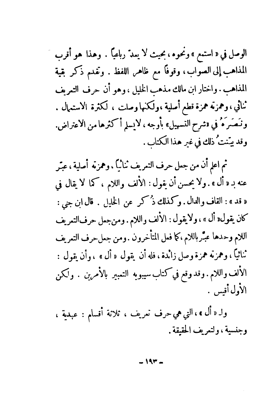 ثم أعلم أن من جعل حرف التعريف ثنائياً، وهمزته أصلية، عبر عنه ب أل. ولا يحسن أن يقول: الألف واللام، كما لا يقال في قد: القاف والدال. وكذلك ذكر عن الخليل. قال ابن جني: كان يقول أل، ولا يقول: الألف واللام. ومن جعل حرف التعريف اللام وحدها عبر باللام، كما فعل المتأخرون. ومن جعل حرف التعريف ثنائياً، وهمزته همزة وصل زائدة، فله أن يقول أل، وأن يقول: الألف واللام. وقد وقع في كتاب سيبويه التعبير بالأمرين. ولكن الأول أقيس.