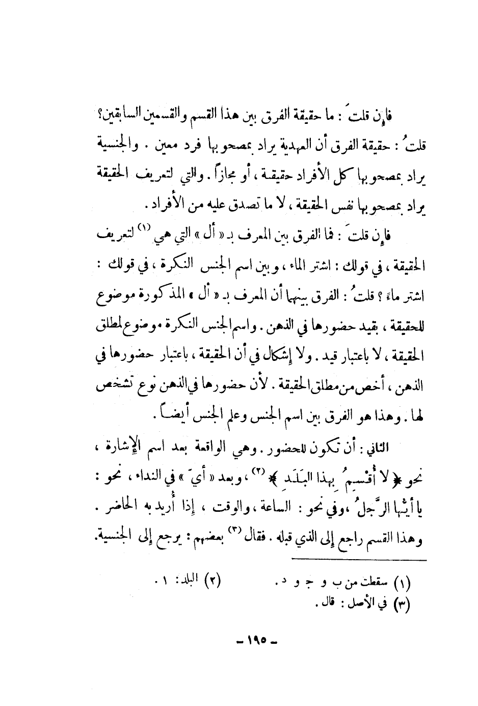 فإن قلت: ما حقيقة الفرق بين هذا القسم والقسمين السابقين؟ قلت: حقيقة الفرق أن العهدية يراد بمصحوبها فرد معين. والجنسية يراد بمصحوبها نفس الحقيقة، لا ما تصدق عليه من الأفراد.
