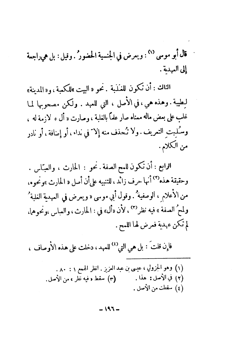الرابع: أن تكون للمح الصفة. نحو: الحارث، والعباس. وحقيقة هذه أنها حرف زائد، للتبيه على أن أصل الحارث ونحوه، من الأعلام، الوصفية. وقول أبي موسى ويعرض في العهدية الغلبة ولمح الصفة فيه نظر، لأن أل في: الحارث، والعباس، ونحوهما، لم تكن عهدية فعرض لها اللمح.