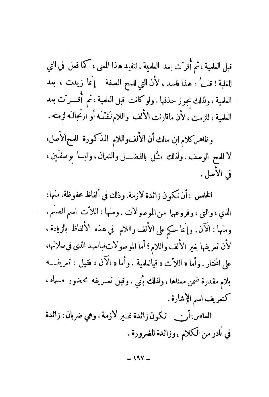 الخامس: أن تكون زائدة لازمة. وذلك في ألفاظ محفوظة. منها: الذي، والتي، وفروعهما من الموصولات. ومنها: اللات اسم الصنم. ومنها: الآن. وإنما حكم على الألف واللام في هذه الألفاظ بالزيادة، لأن تعريفها بغير الألف واللام؛ أما الموصولات فبالعهد الذي في صلاتها، على المختار. وأما اللات فبالعلمية. وأما الآن فقيل: تعريفه بلام مقدرة ضمن معناها، ولذلك بني. وقيل تعريفه بحضور مسماه، كتعريف اسم الإشارة.