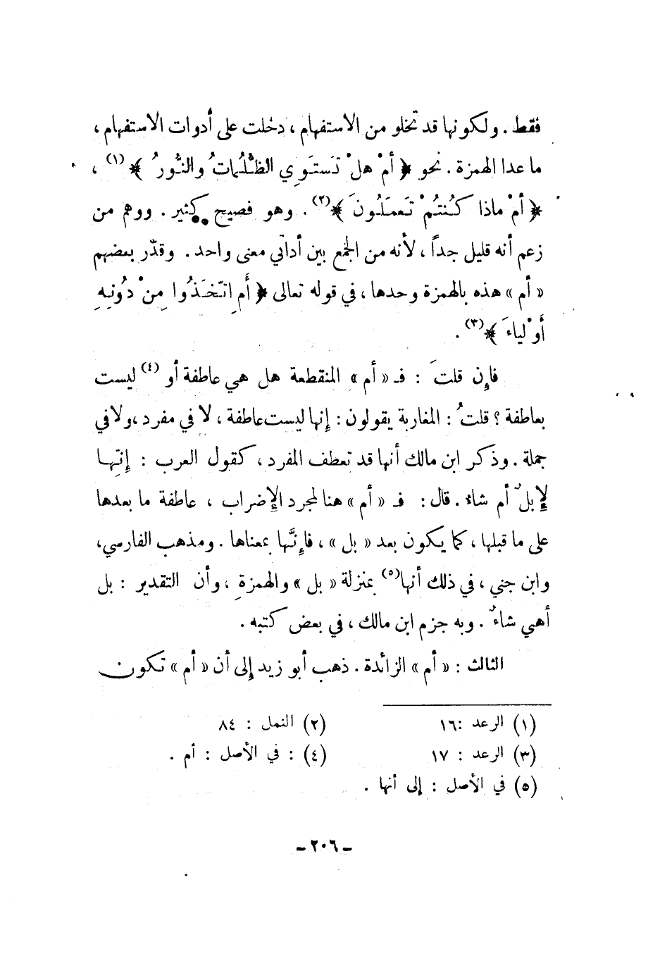 فقط. ولكونها قد تخلو من الاستفهام، دخلت على أدوات الاستفهام، ما عدا الهمزة. نحو " أم هل تستوي الظلمات والنور "، " أم ماذا كنتم تعملون ". وهو فصيح كثير. ووهم من زعم أنه قليل جداً، لأنه من الجمع بين أداتي معنى واحد. وقدر بعضهم أم هذه بالهمزة وحدها، في قوله تعالى " أم اتخذوا من دونه أولياء ".