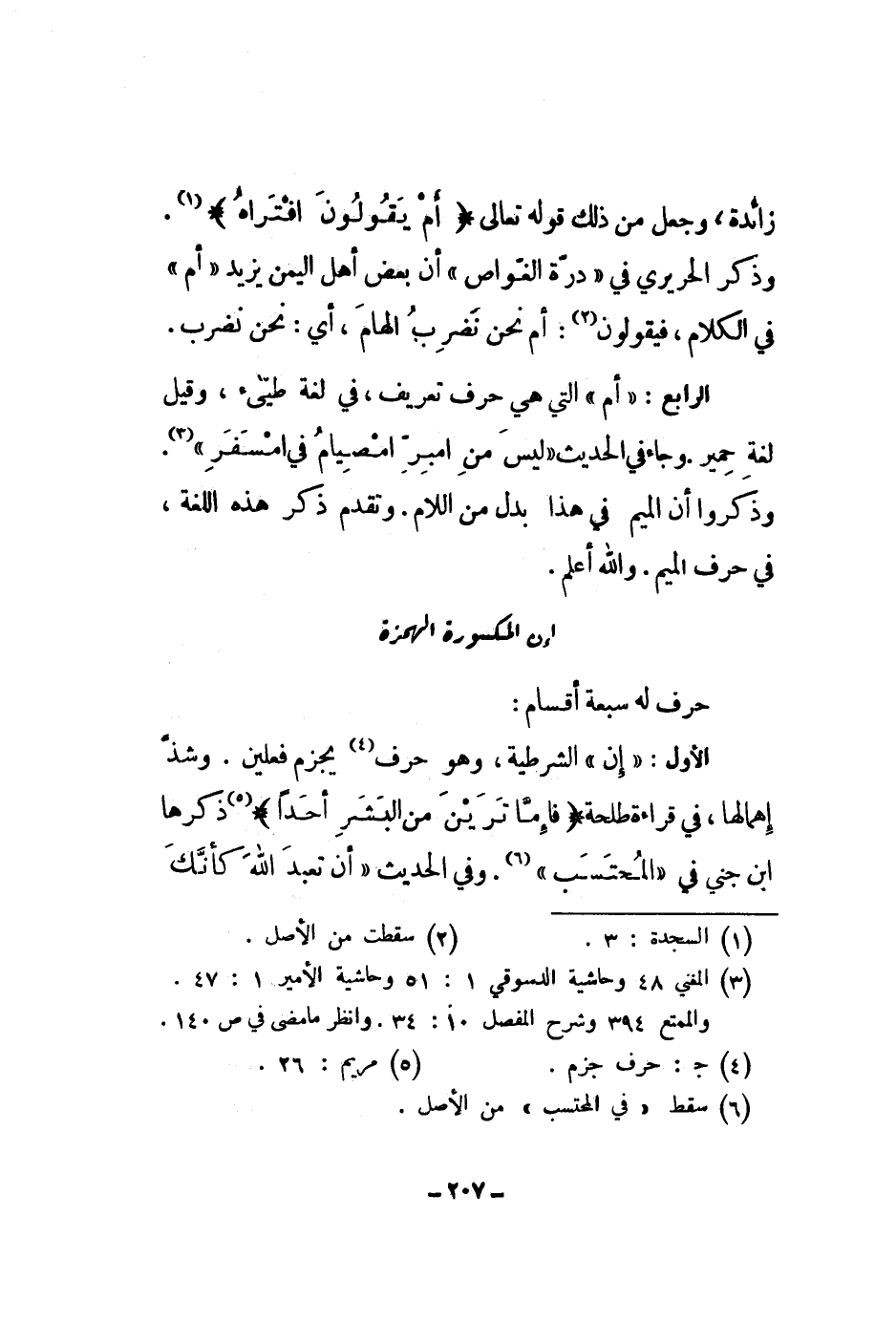 حرف له سبعة أقسام: الأول: إن الشرطية، وهو حرف يجزم فعلين. وشذ إهمالها، في قراءة طلحة " فإما ترين من البشر أحداً " ذكرها ابن جني في المحتسب. وفي الحديث أن تعبد الله كأنك