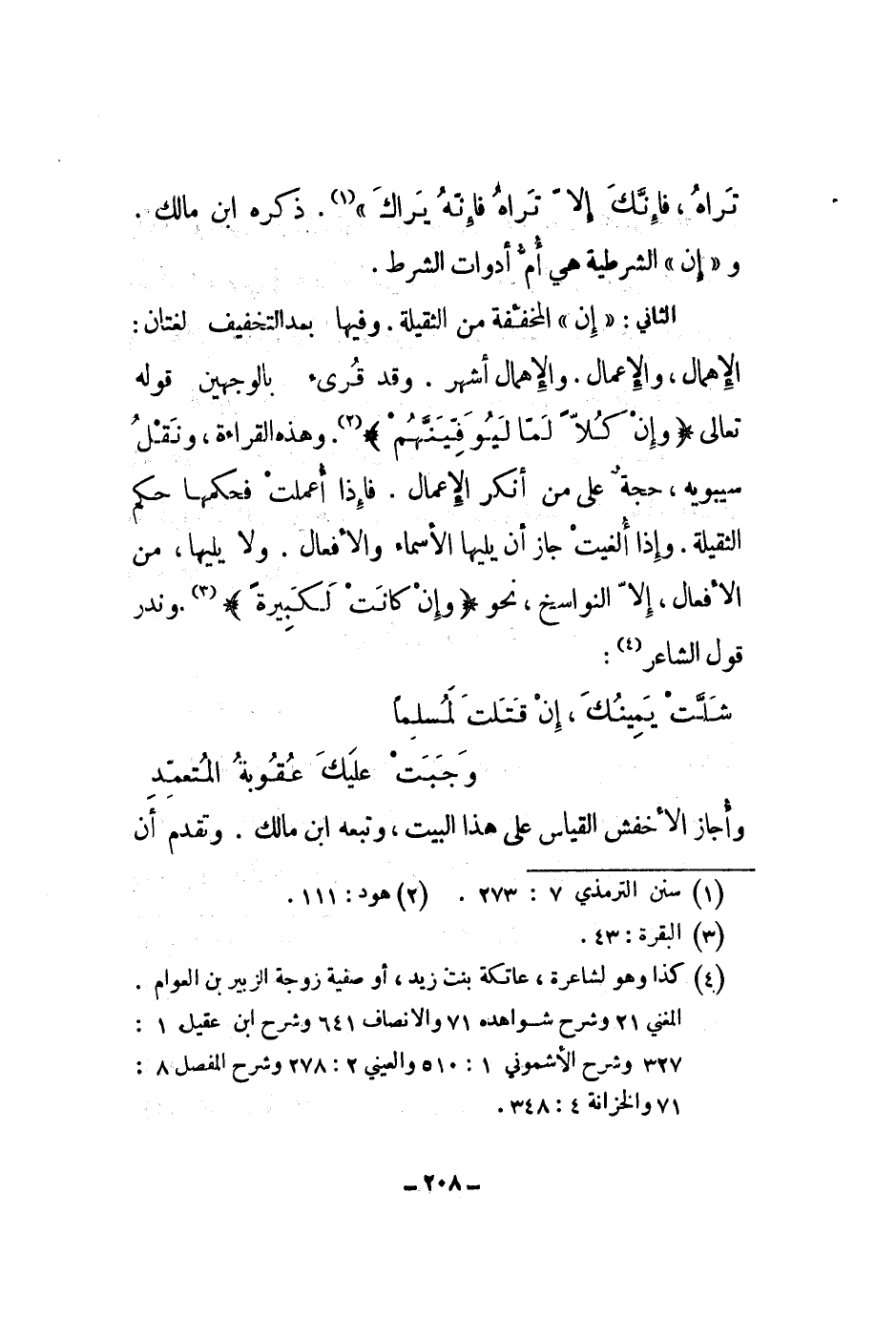 الثاني: إن المخففة من الثقيلة. وفيها بمد التخفيف لغتان: الإهمال، والإعمال. والإهمال أشهر. وقد قرىء بالوجهين قوله تعالى " وإن كلا لما ليوفينهم ". وهذه القراءة، ونقل سيبويه، حجة على من أنكر الإعمال. فإذا أعملت فحكمها حكم الثقيلة. وإذا ألغيت جاز أن يليها الأسماء والأفعال. ولا يليها، من الأفعال، إلا النواسخ، نحو " وإن كانت لكبيرة ". وندر قول الشاعر: