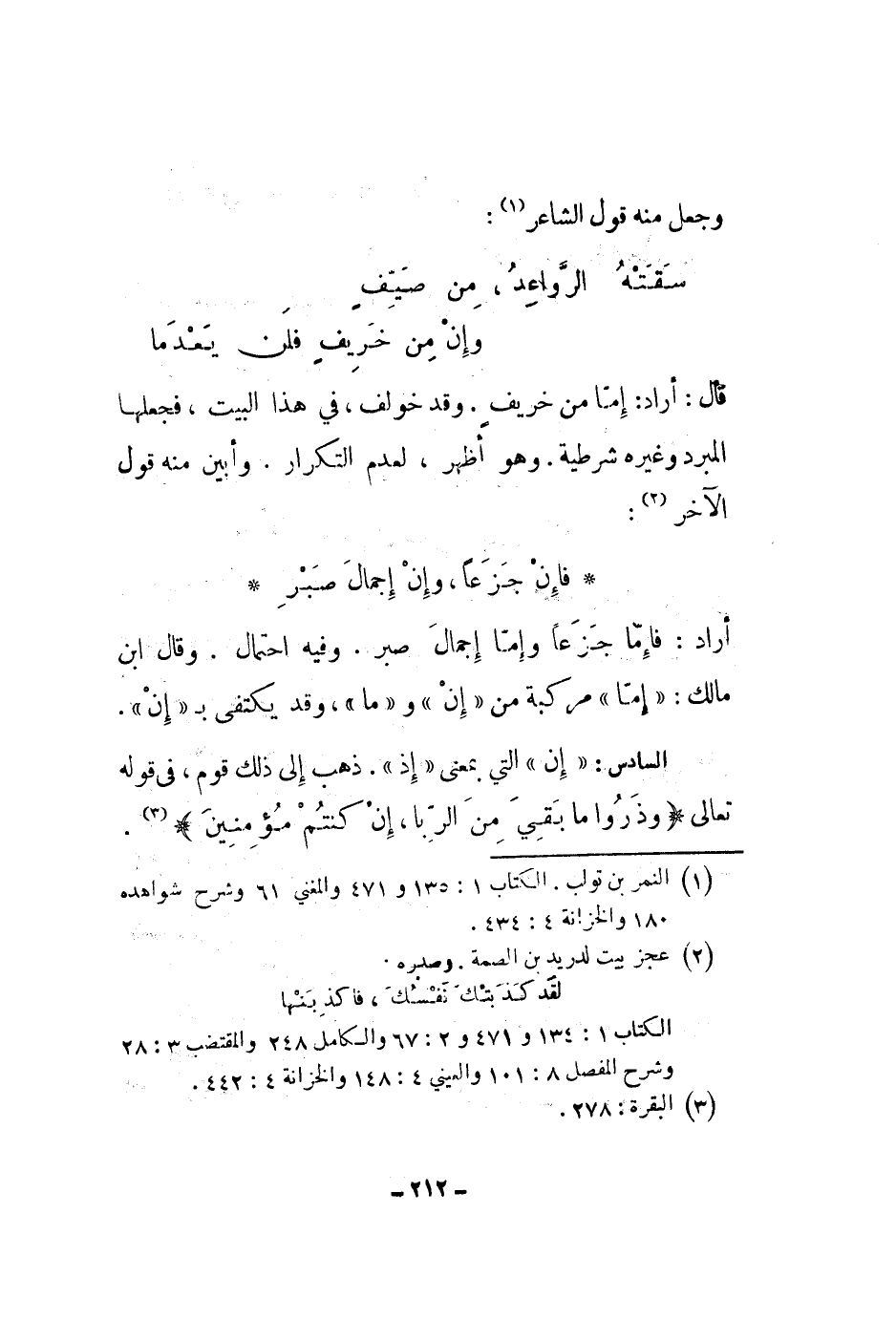 قال: أراد: إما من خريف. وقد خولف، في هذا البيت. فجعلها المبرد وغيره شرطية. وهو أظهر، لعدم التكرار. وأبين منه قول الآخر: فإن جزعاً، وإن إجمال صبر أراد: فإما جزعاً وإما إجمال صبر. وفيه احتمال. وقال ابن مالك: إما مركبة من إن وما، وقد يكتفى ب إن.