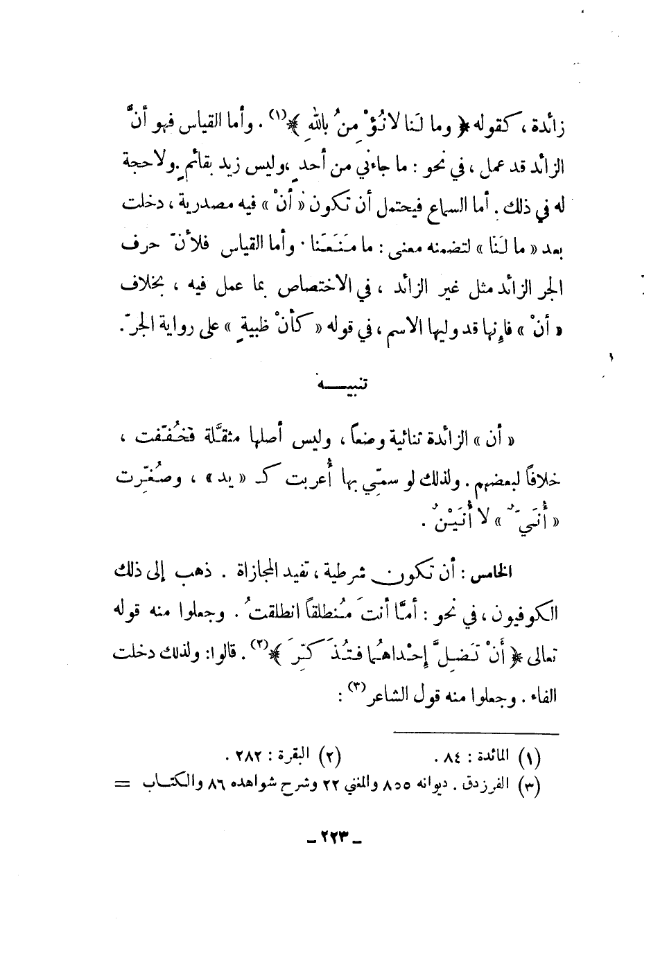 زائدة، كقوله " وما لنا لا نؤمن بالله ". وأما القياس فهو أن الزائد قد عمل، في نحو: ما جاءني من أحد، وليس زيد بقائم. ولا حجة له في ذلك. أما السماع فيحتمل أن تكون أن فيه مصدرية، دخلت بعد ما لنا لتضمنه معنى: ما منعنا. وأما القياس فلأن حرف الجر الزائد مثل غير الزائد، في الاختصاص بما عمل فيه، بخلاف أن فإنها قد وليها الاسم، في قوله كأن ظبية على رواية الجر.