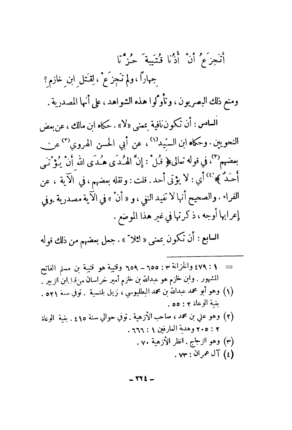 السادس: أن تكون نافية بمعنى لا. حكاه ابن مالك، عن بعض النحويين. وحكاه ابن السيد، عن أبي الحسن الهروي عن بعضهم، في قوله تعالى " قل: إن الهدى هدى الله أن يؤتى أحد " أي: لا يؤتى أحد. قلت: ونقله بعضهم، في الآية، عن الفراء. والصحيح أنها لا تفيد النفي، وأن في الآية مصدرية. وفي إعرابها أوجه، ذكرتها في غير هذا الموضع.