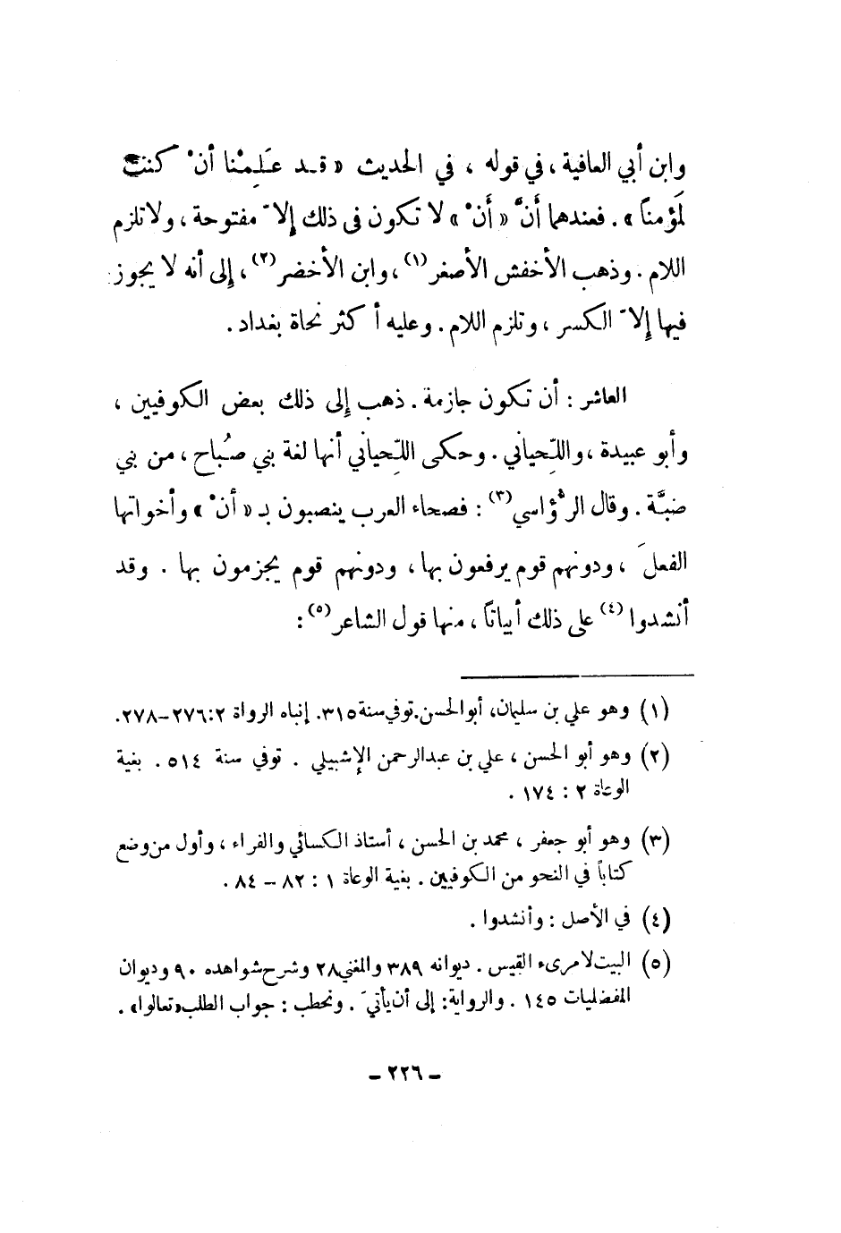 وابن أبي العافية، في قوله، في الحديث قد علمنا أن كنت لمؤمناً. فعندهما أن أن لا تكون في ذلك إلا مفتوحة، ولا تلزم اللام. وذهب الأخفش الأصغر، وابن الأخضر، إلى أنه لا يجوز فيها إلا الكسر، وتلزم اللام. وعليه أكثر نحاة بغداد.