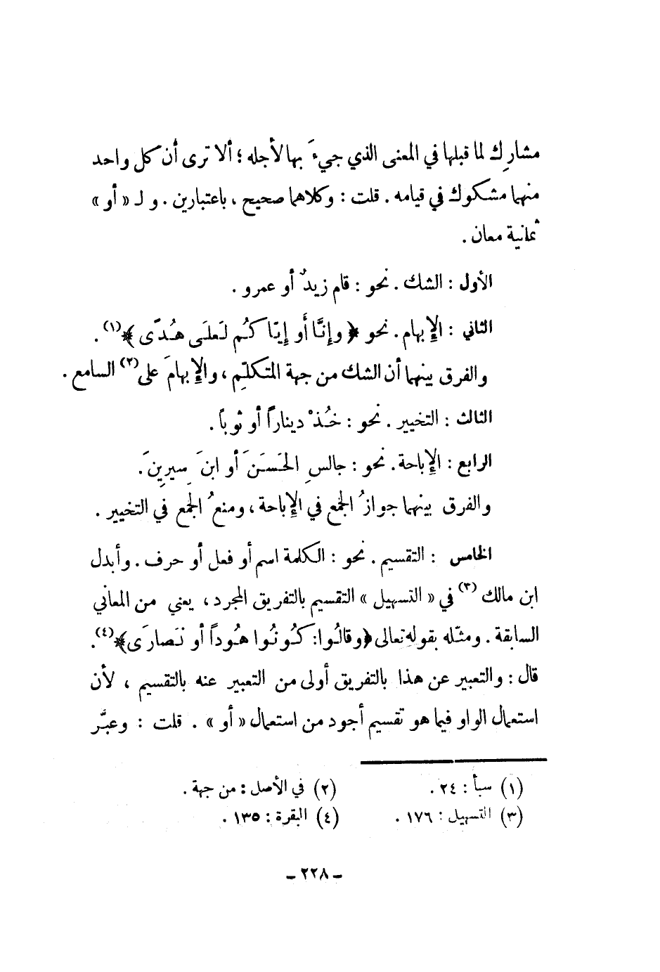 الخامس: التقسيم. نحو: الكلمة اسم أو فعل أو حرف. وأبدل ابن مالك في التسهيل التقسيم بالتفريق المجرد، يعني من المعاني السابقة. ومثله بقوله تعالى " وقالوا: كونوا هوداً أو نصارى ". قال: ولتعبير عن هذا بالتفريق أولى من التعبير عنه بالتقسيم، لأن استعمال الواو فيما هو تقسيم أجود من استعمال أو. قلت: وعبر