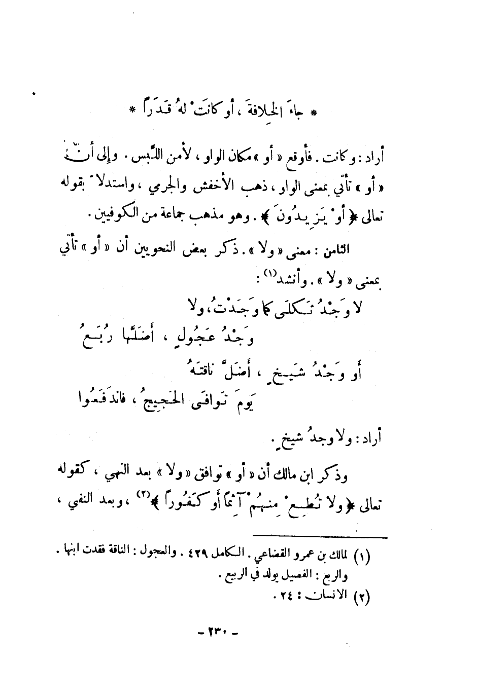 جاء الخلافة، أو كانت له قدراً أراد: وكانت. فأوقع أو مكان الواو، لأمن اللبس. وإلى أن أو تأتي بمعنى الواو، ذهب الأخفش والجرمي، واستدلا بقوله تعالى " أو يزيدون ". وهو مذهب جماعة من الكوفيين.