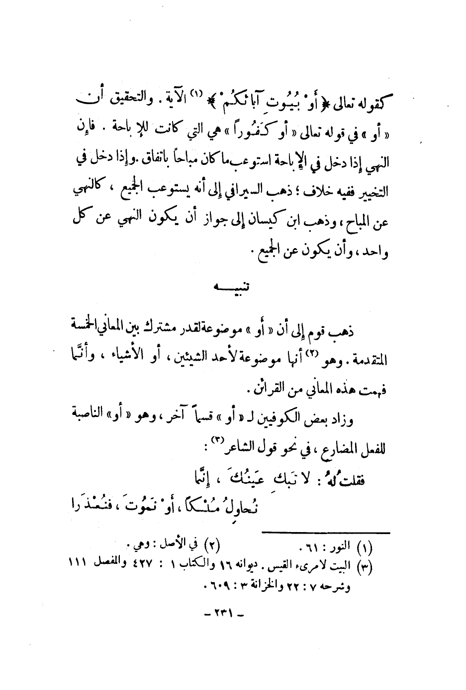 كقوله تعالى " أو بيوت آبائكم " الآية. والتحقيق أن أو في قوله تعالى أو كفوراً هي التي كانت للإباحة. فإن النهي إذا دخل في الإباحة استوعب ما كان مباحاً باتفاق. وإذا دخل في التخيير ففيه خلاف؛ ذهب السيرافي إلى أنه يستوعب الجميع، كالنهي عن المباح، وذهب ابن كيسان إلى جواز أن يكون النهي عن كل واحد، وأن يكون عن الجميع.