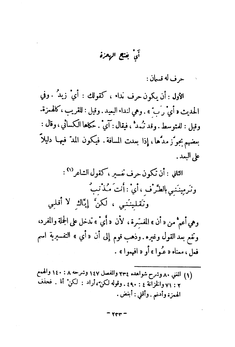 حرف له قسمان: الأول: أن يكون حرف نداء، كقولك: أي زيد. وفي الحديث أي رب. وهي لنداء البعيد. وقيل: للقريب، كالهمزة، وقيل: للمتوسط. وقد تمد، فيقال: آي. حكاها الكسائي، وقال: بعضهم يجوز مدها، إ