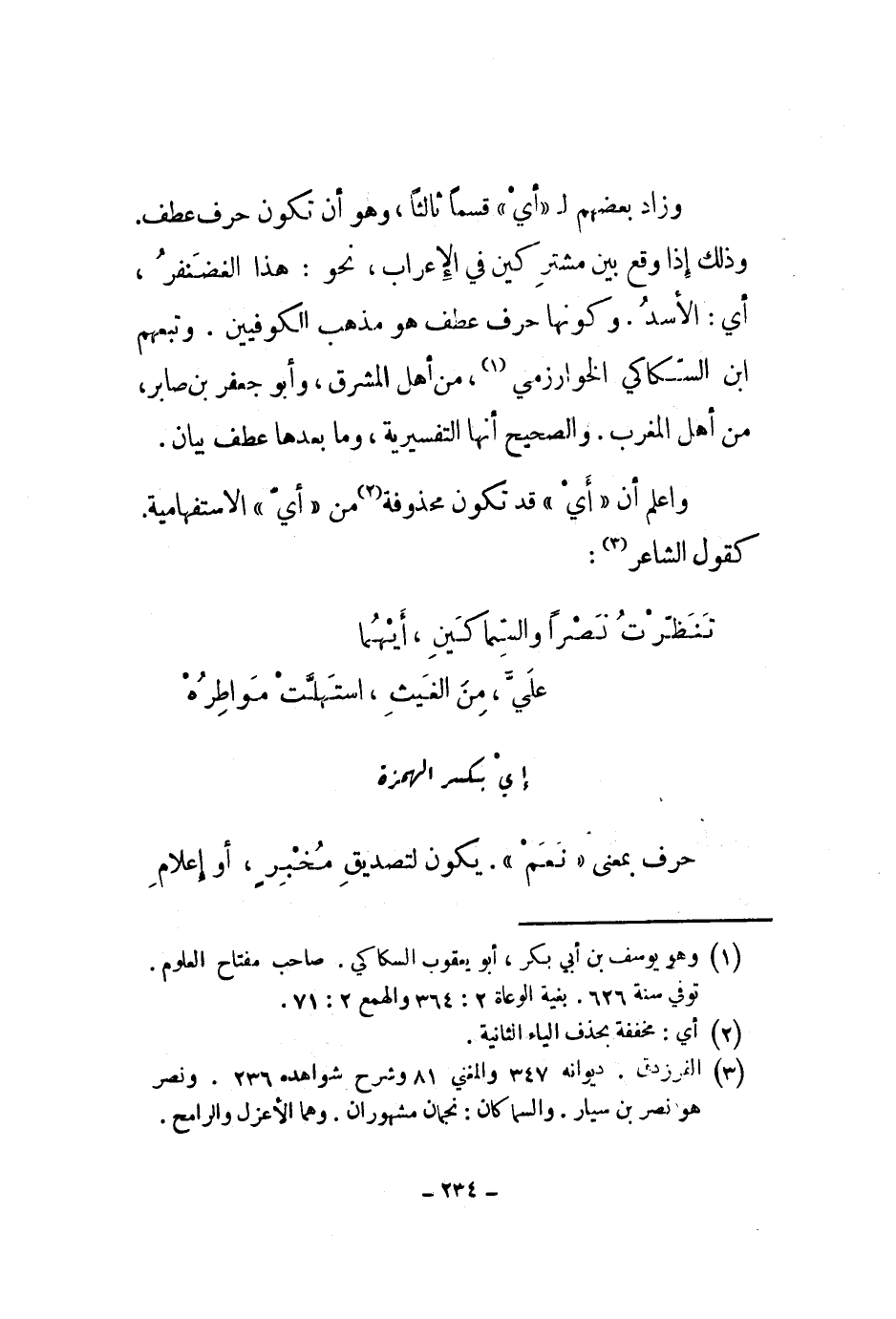 وزاد بعضهم ل أي قسماً ثالثاً، وهو أن تكون حرف عطف. وذلك إذا وقع بين مشتركين في الإعراب، نحو: هذا الغضفر، أي: الأسد. وكونها حرف عطف هو مذهب الكوفيين. وتبعهم ابن السكاكي الخوارزمي، من أهل الشرق، وأبو جعفر بن صابر، من أهل المغرب. والصحيح أنها التفسيرية، وما بعدها عطف بيان.