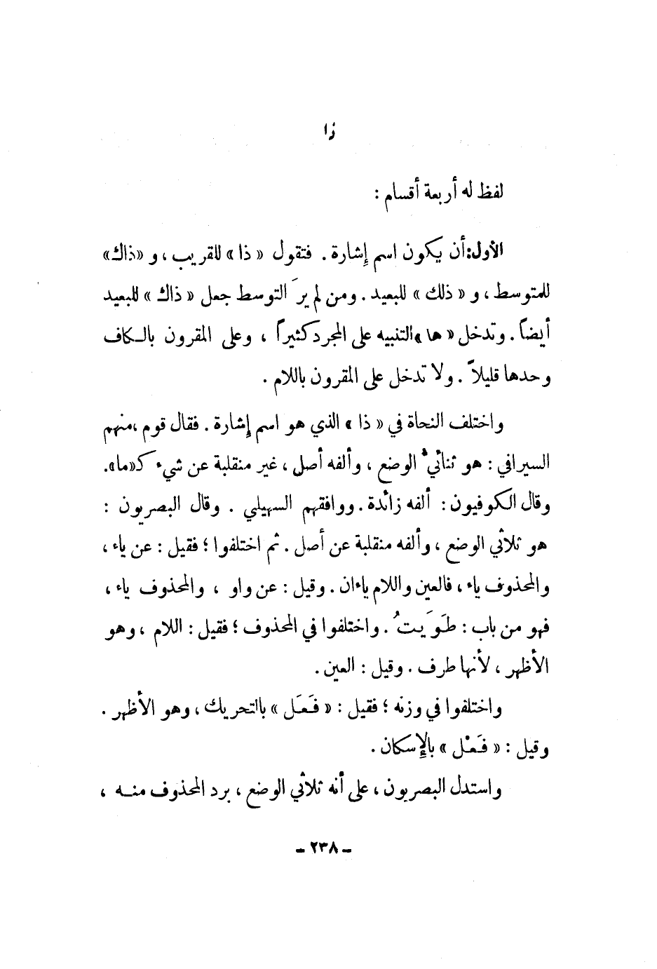 لفظ له أربعة أقسام: الأول: أن يكون اسم إشارة. فتقول ذا للقريب، وذاك للمتوسط، وذلك للبعيد. ومن لم ير التوسط جعل ذاك للبعيد أيضاً. وتدخل ها التنبيه على المجرد كثيراً، وعلى المقرون بالكاف وحدها قليلاً. ولا تدخل على المقرون باللام.