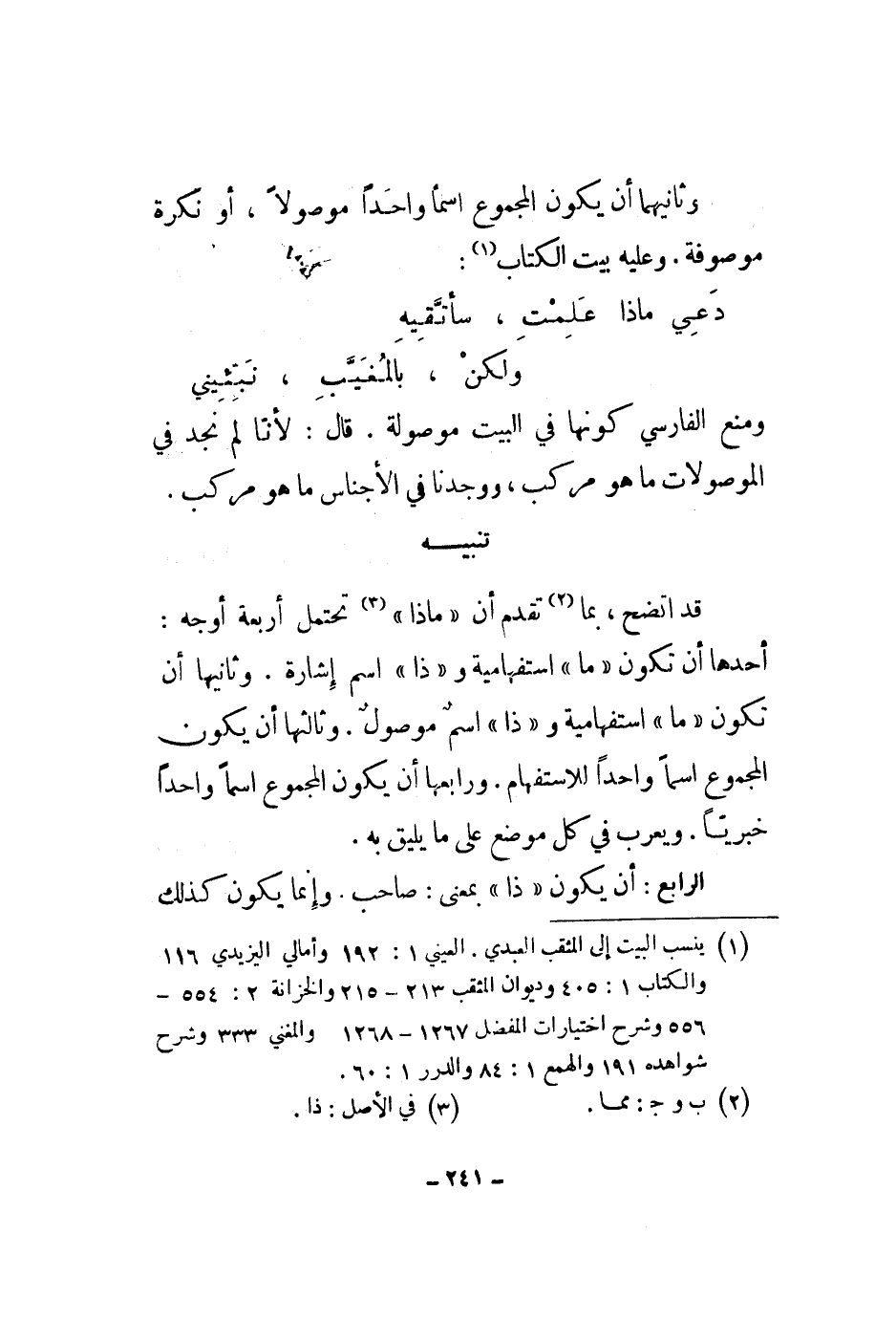 ومنع الفارسي كونها في البيت موصولة. قال: لأنا لم نجد في الموصولات ما هو مركب، ووجدنا في الأجناس ما هو مركب.