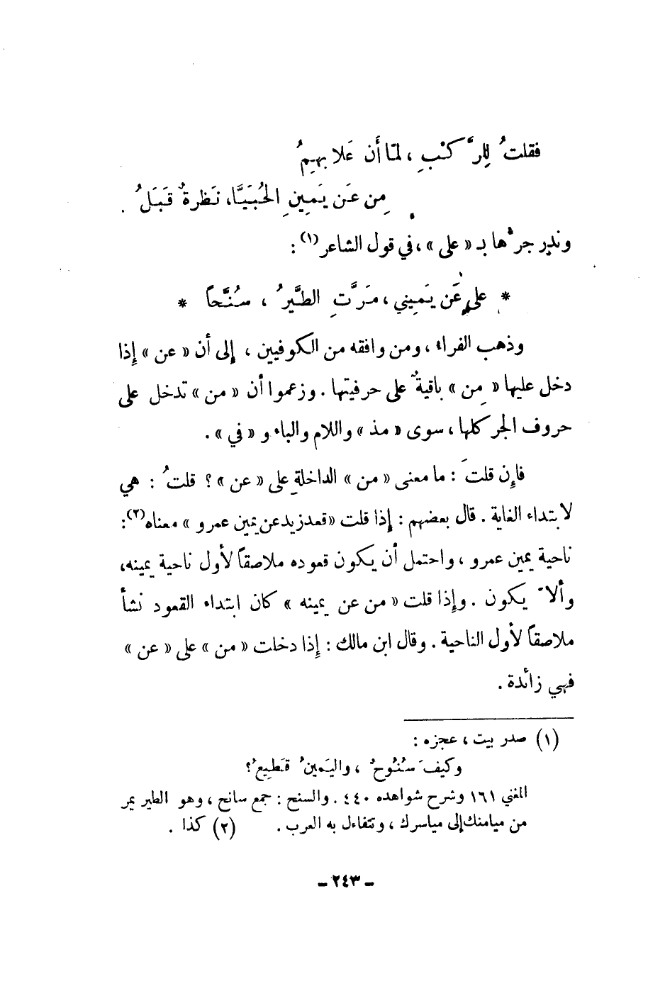 وندرجرها ب على، في قول الشاعر: على عن يميني، مرت الطير، سنحاً وذهب الفراء، ومن وافقه من الكوفيين، إلى أن عن إذا دخل عليها من باقية على حرفيتها. وزعموا أن من تدخل على حروف الجر كلها، سوى مذ واللام والباء وفي.