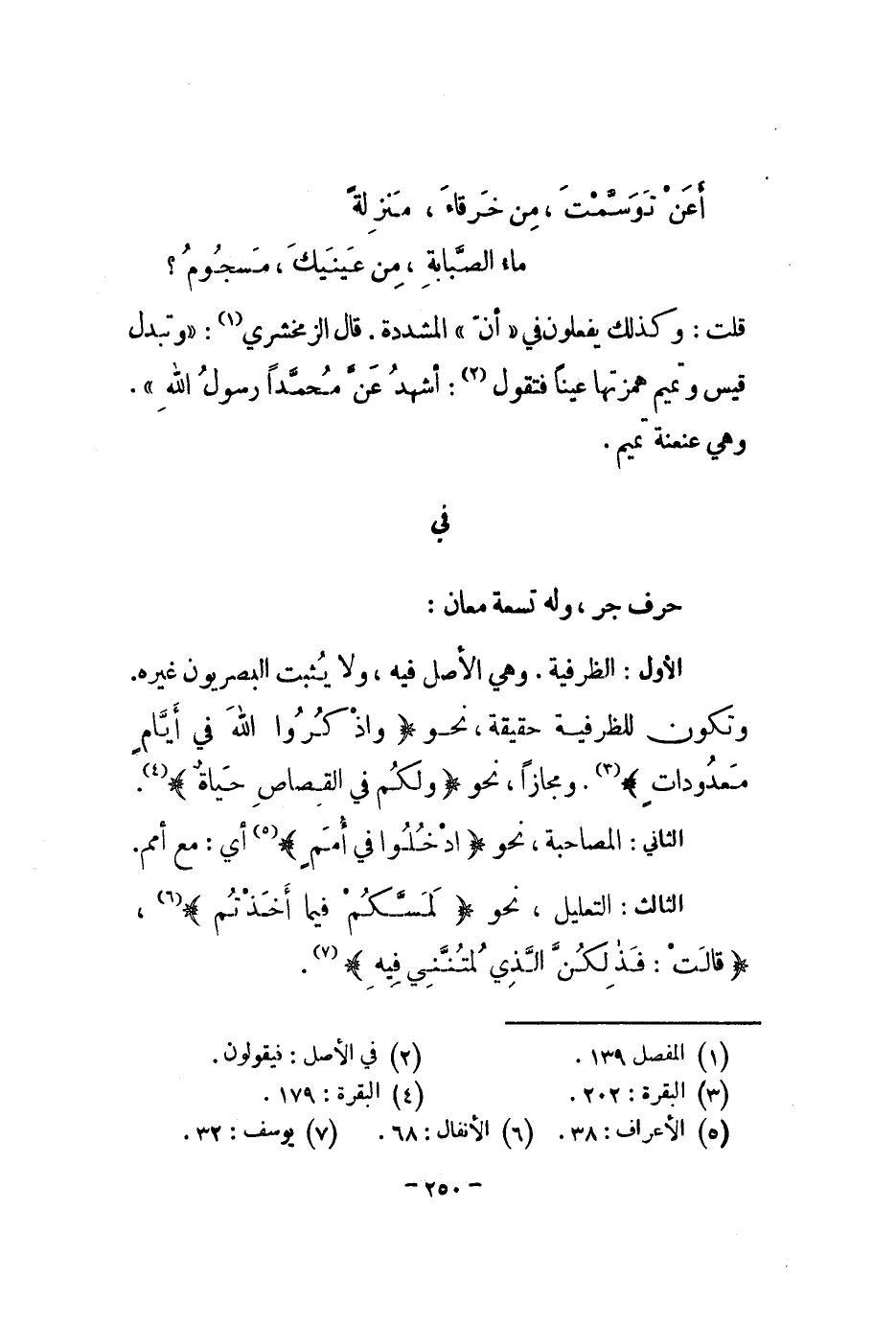 حرف جر، وله تسعة معان: الأول: الظرفية. وهي الأصل فيه، ولا يثبت البصريون غيره. وتكون للظرفية حقيقة، نحو " واذكروا الله في أيام معدودات ". ومجازاً، نحو " ولكم في القصاص حياة ".