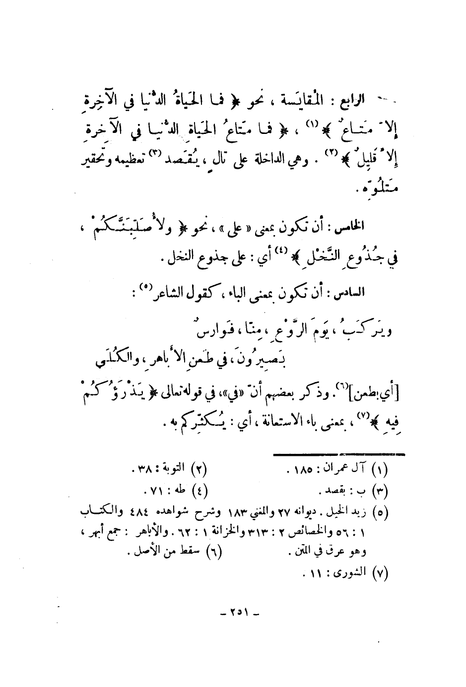 الخامس: أن تكون بمعنى على، نحو " ولأصلبنكم، في جذوع النخل " أي: على جذوع النخل.