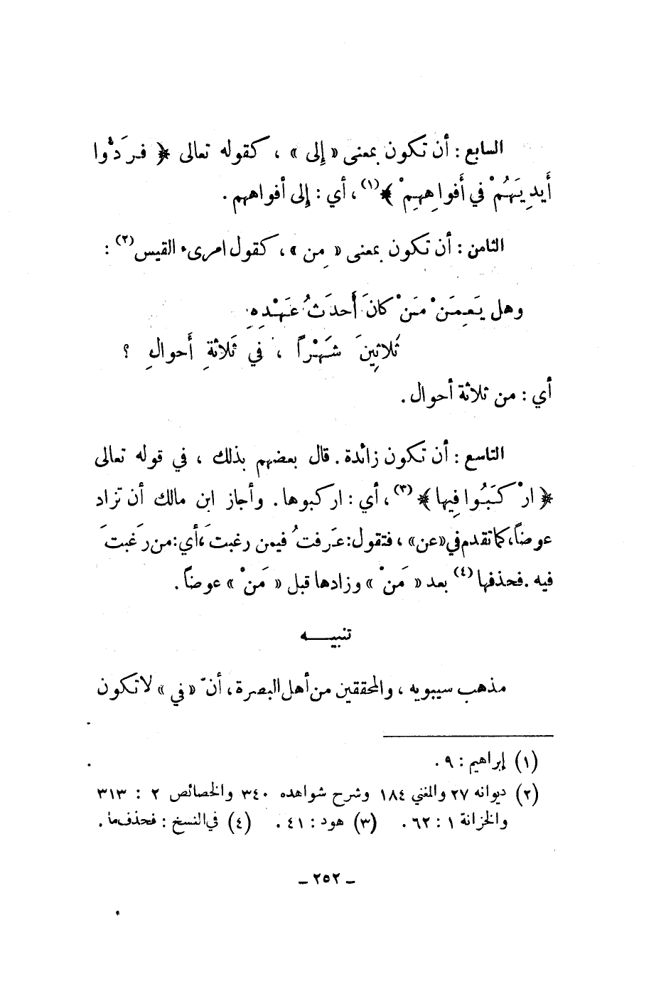 السابع: أن تكون بمعنى إلى، كقوله تعالى " فردوا أيديهم في أفواههم "، أي: إلى أفواههم.