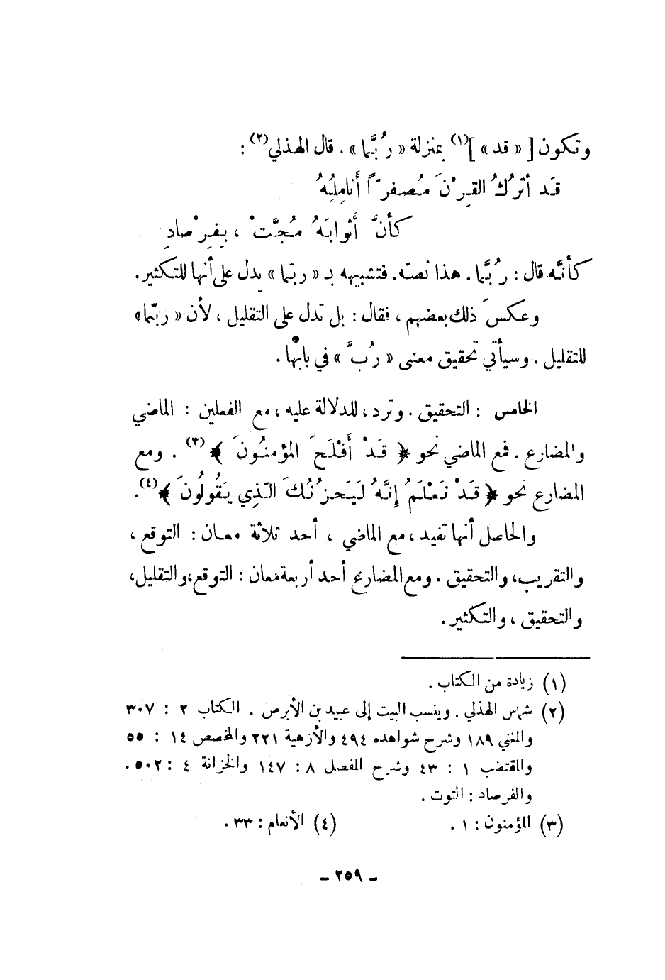 الخامس: التحقيق. وترد، للدلالة عليه، مع الفعلين: الماضي والمضارع. فمع الماضي نحو " قد أفلح المؤمنون ". ومع المضارع نحو " قد نعلم إنه ليحزنك الذي يقولون ".