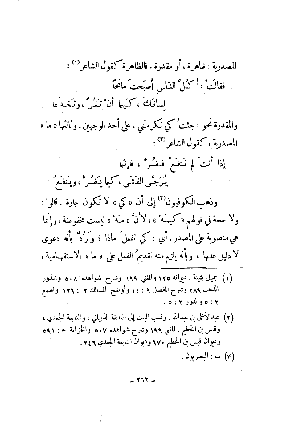 والمقدرة نحو: جئت كي تكرمني. على أحد الوجهين. وثالثها ما المصدرية، كقول الشاعر: