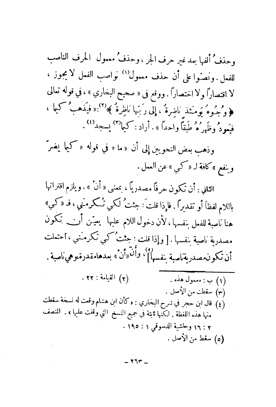 وحذف ألفها بعد غير حرف الجر، وحذف معمول الحرف الناصب للفعل. ونصوا على أن حذف معمول نواصب الفعل لا يجوز، لا اقتصاراً ولا اختصاراً. ووقع في صحيح البخاري، في قوله تعالى " وجوه يومئذ ناضرة، إلى ربها ناظرة ": فيذهب كيما، فيعود وظهره طبقاً واحداً. أراد: كيما يسجد.