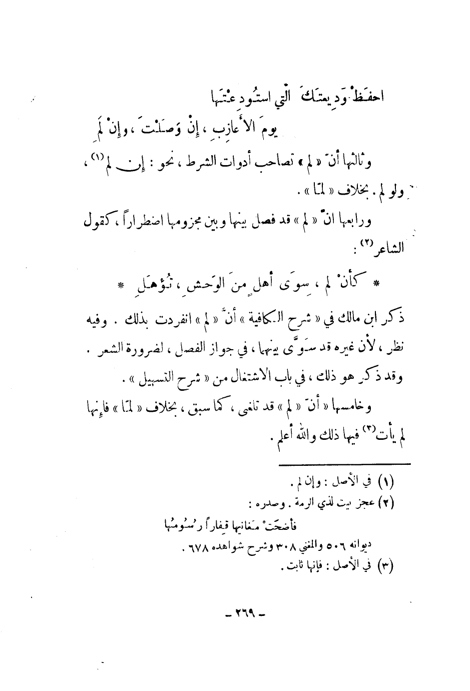 ورابعها أن لم قد فصل بينها وبين مجزومها اضطراراً، كقول الشاعر: كأن لم، سوى أهل من الوحش، تؤهل ذكر ابن مالك في شرح الكافية أن لم انفردت بذلك. وفيه نظر، لأن غيره قد سوى بينهما، في جواز الفصل، لضرورة الشعر. وقد ذكر هو ذلك، في باب الاستغال من شرح التسهيل.