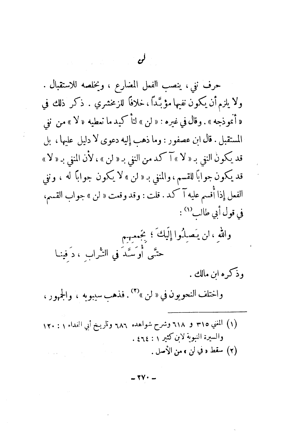 حرف نفي، ينصب الفعل المضارع، ويخلصه للاستقبال. ولا يلزم أن يكون نفيها مؤبداً، خلافاً للزمخشري. ذكر ذلك في أنموذجه. قال في غيره: لن لتأكيد ما تعطيه لا من نفي المستقبل. قال ابن عصفور: وما ذهب إليه دعوى لا دليل عليها، بل قد يكون النفي ب لا آكد من النفي ب لن، لأن المنفي ب لا قد يكون جواباً للقسم، والمنفي ب لن لا يكون جواباً له، ونفي الفعل إذا أقسم عليه آكد. قلت: وقد وقعت لن جواب القسم، في قول أبي طالب: