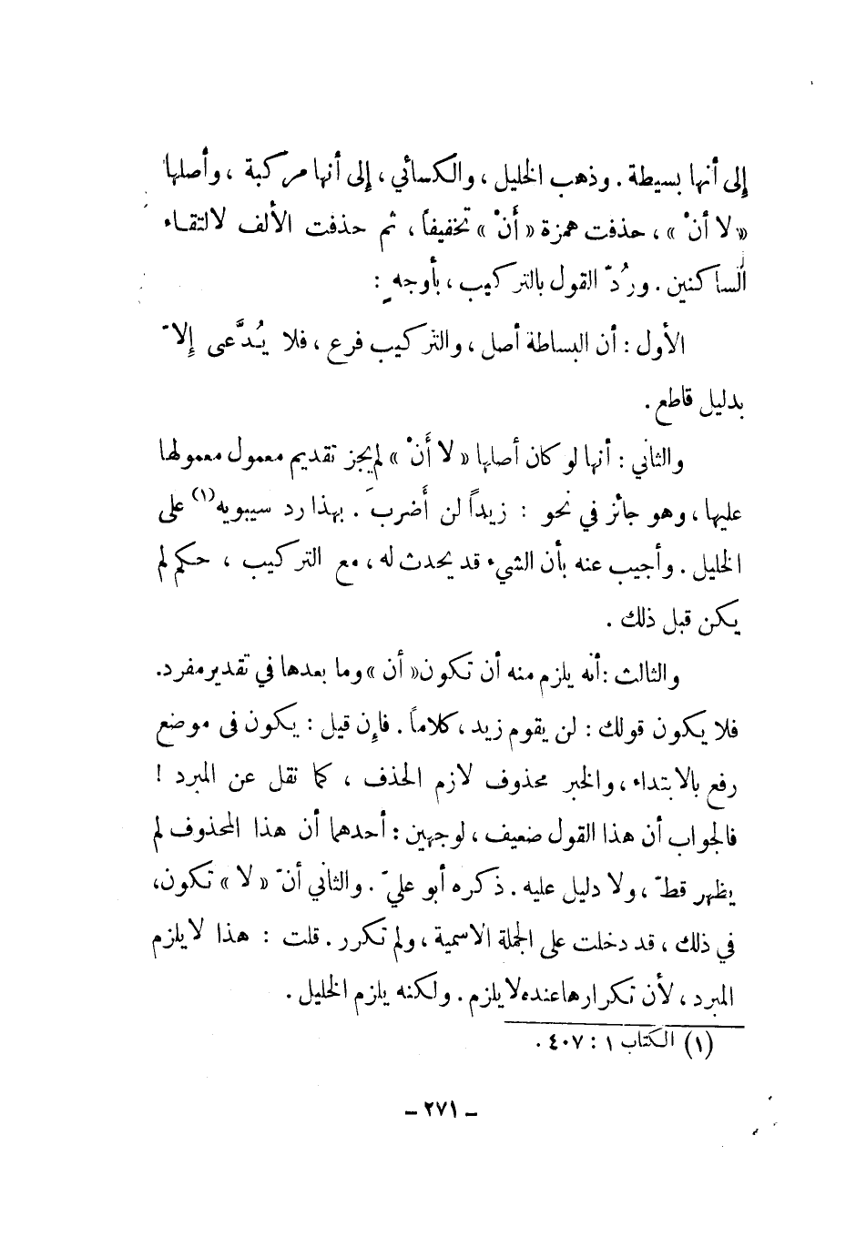 إلى أنها بسيطة. وذهب الخليل، والكسائي، إلى أنها مركبة، وأصلها لا أن، حذفت همزة أن تخفيفاً، ثم حذفت الألف لالتقاء الساكنين. ورد القول بالتركيب، بأوجه: الأول: أن البساطة أصل، والتركيب فرع، فلا يدعى إلا بدليل قاطع.