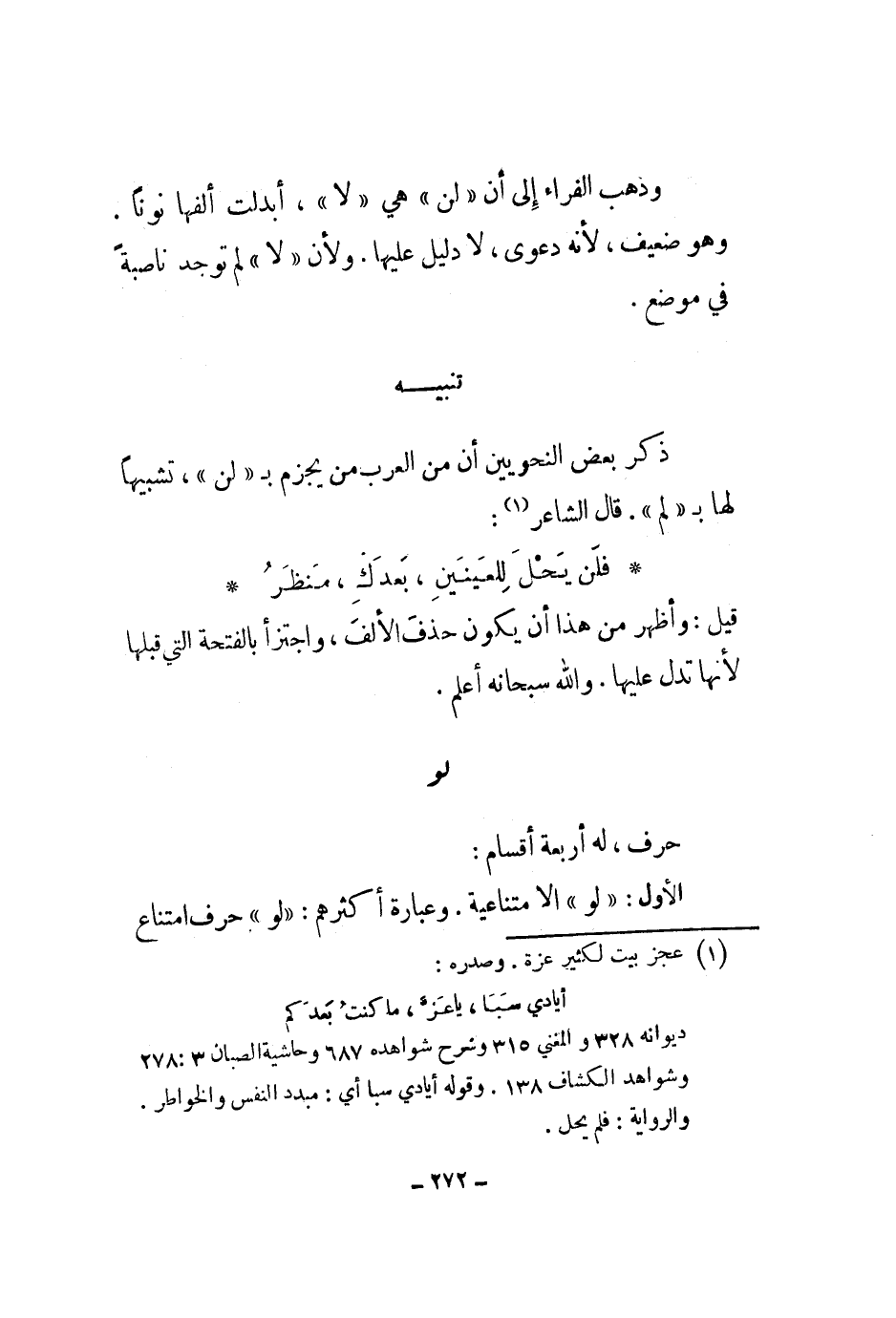 وذهب الفراء إلى أن لن هي لا، أبدلت ألفها نوناً. وهو ضعيف، لأنه دعوى، لا دليل عليها. ولأن لا لم توجد ناصبة في موضع.
