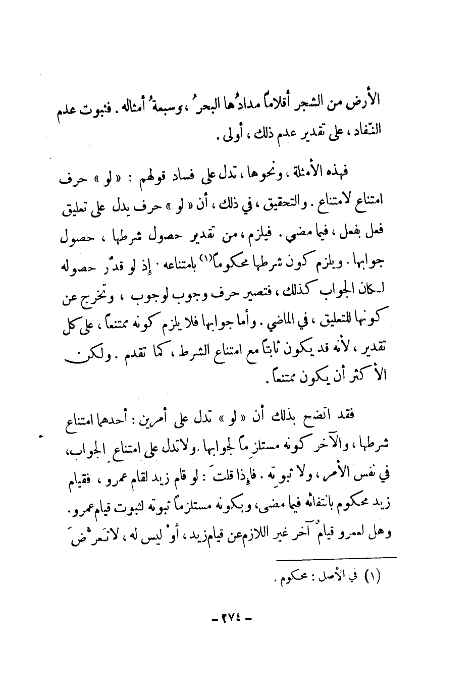 فقد اتضح بذلك أن لو تدل على أمرين: أحدهما امتناع شرطها، والآخر كونه مستلزماً لجوابها. ولا تدل على امتناع الجواب، في نفس الأمر، ولا ثبوته. فإذا قلت: لو قام زيد لقام عمرو، فقيام زيد محكوم بانتفائه فيما مضى، وبكونه مستلزماً ثبوته لثبوت قيام عمرو. وهل لعمرو قيام آخر غير اللازم عن قيام زيد، أو ليس له، لا تعرض