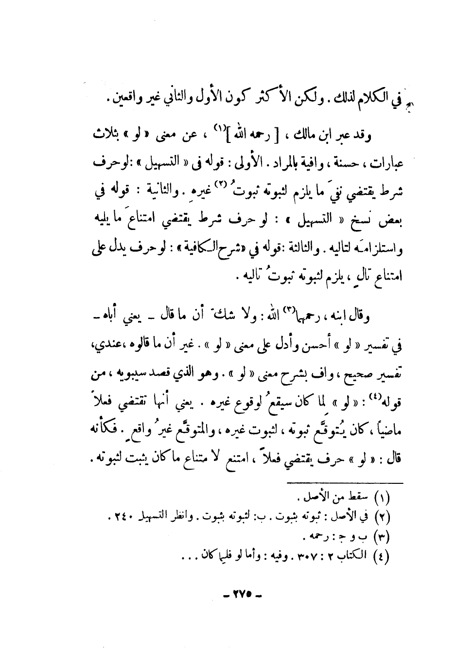 وقد عبر ابن مالك، رحمه الله، عن معنى لو بثلاث عبارات، حسنة، وافية بالمراد. الأولى: قوله في التسهيل: لو حرف شرط يقتضي نفي ما يلزم لثبوته ثبوت غيره. والثانية: قوله في بعض نسخ التسهيل: لو حرف شرط يقتضي امتناع ما يليه واستلزامه لتاليه. والثالثة: قوله في شرح الكافية: لو حرف يدل على امتناع تال، يلزم لثبوته ثبوت تاليه.