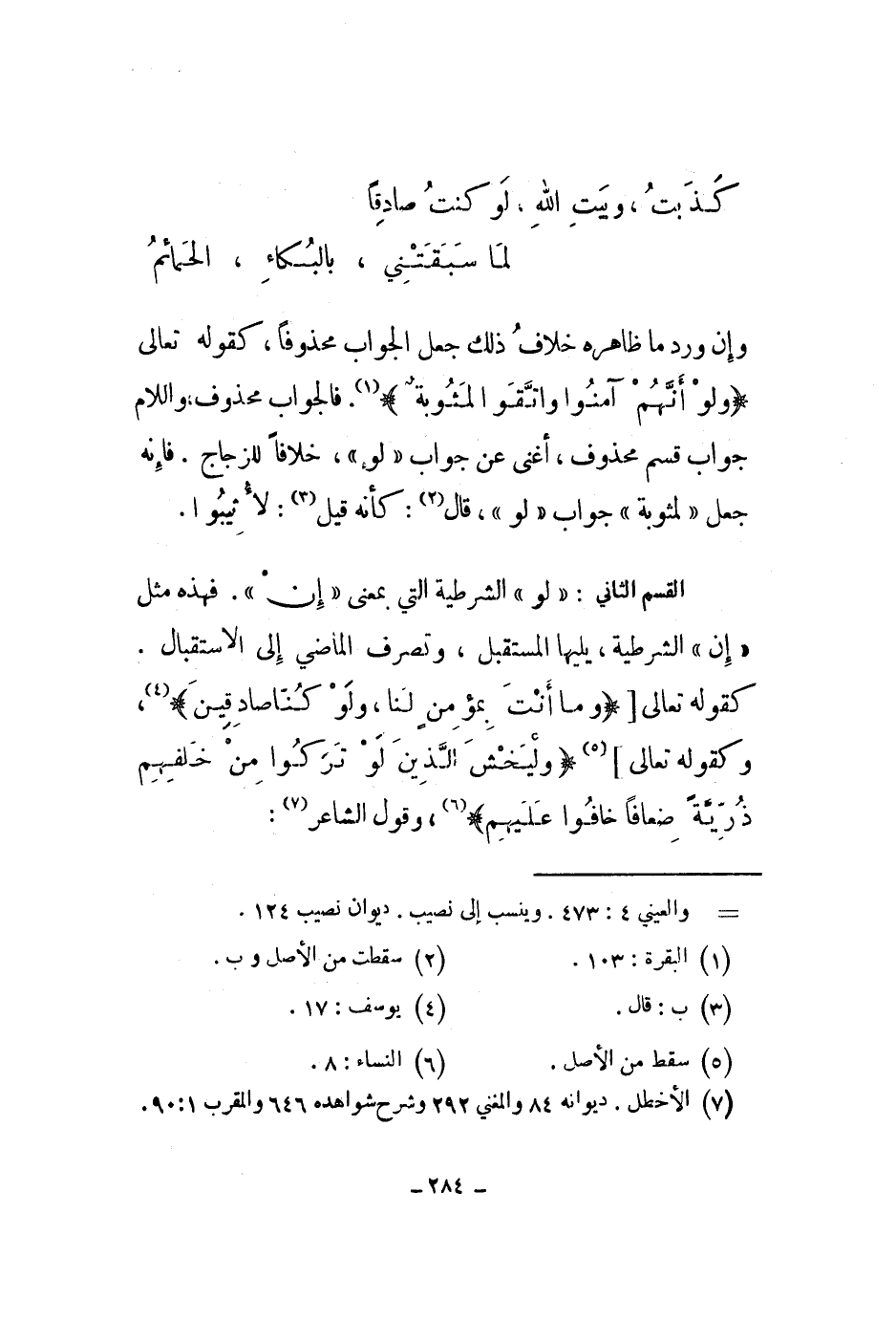 لاف ذلك جعل الجواب محذوفاً، كقوله تعالى " ولو أنهم آمنوا واتقوا لمثوبة ". فالجواب محذوف، واللام جواب قسم محذوف، أغنى عن جواب لو، خلافاً للزجاج. فإنه جعل لمثوبة جواب لو، قال: كأنه قيل: لأثيبوا.