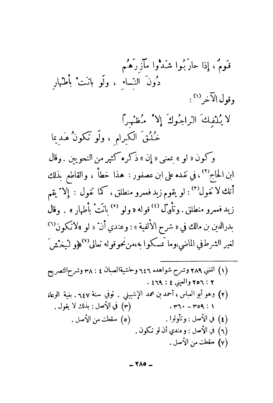 وكون لو بمعنى إن ذكره كثير من النحويين. وقال ابن الحاج، في نقده على ابن عصفور: هذا خطأ، والقاطع بذلك أنك لا تقول: لو يقوم زيد فعمرو منطلق، كما تقول: إلا يقم زيد فعمرو منطلق، وتأول قوله ولو باتت بأطهار. وقال بدر الدين بن مالك في شرح الألفية: وعندي أن لولا تكون لغير الشرط في الماضي، وما تمسكوا به، من نحو قوله تعالى " وليخش