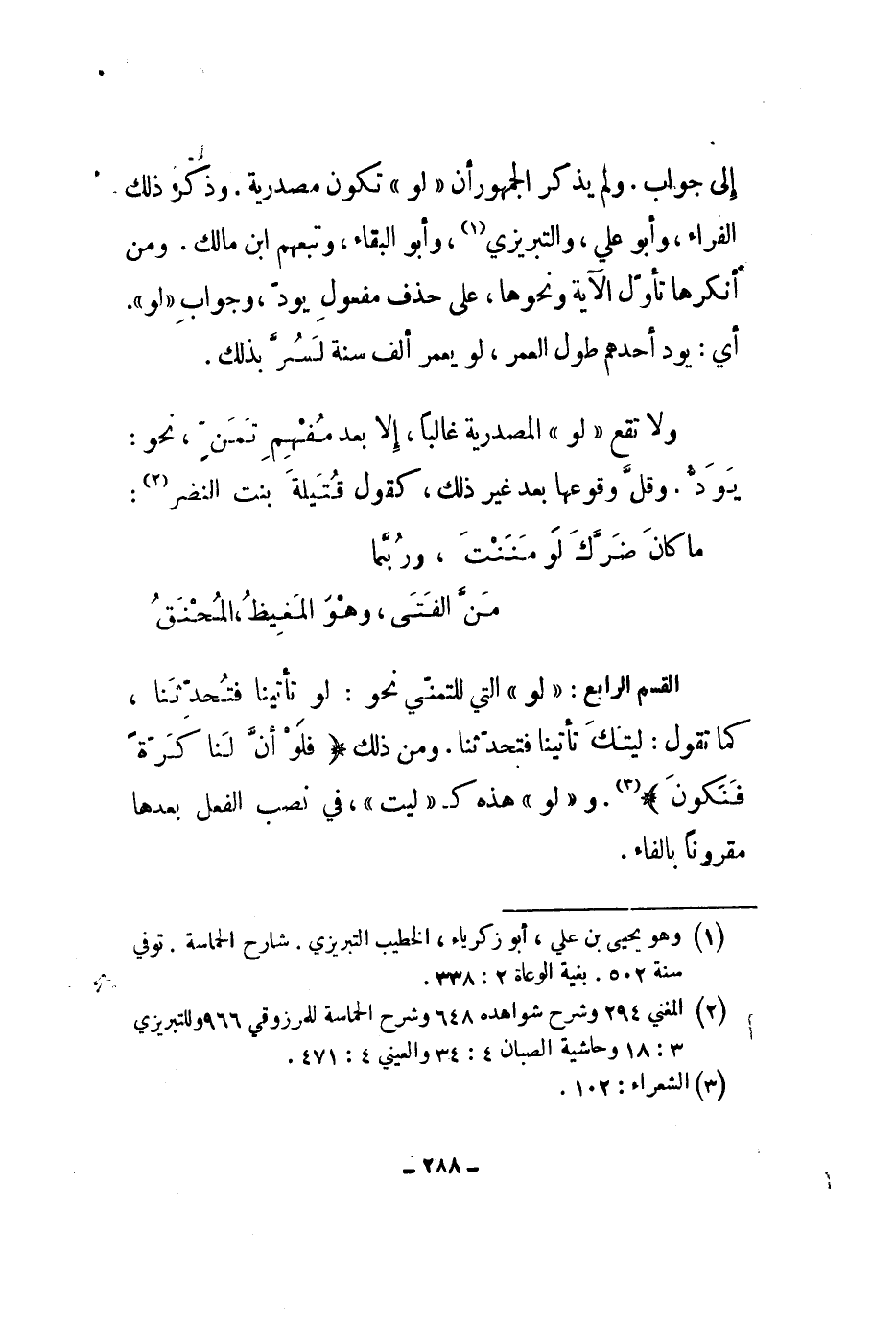 ولا تقع لو المصدرية غالباً، إلا بعد مفهم تمن، نحو: يود. وقل وقوعها بعد غير ذلك، كقول قتيلة بنت النضر: