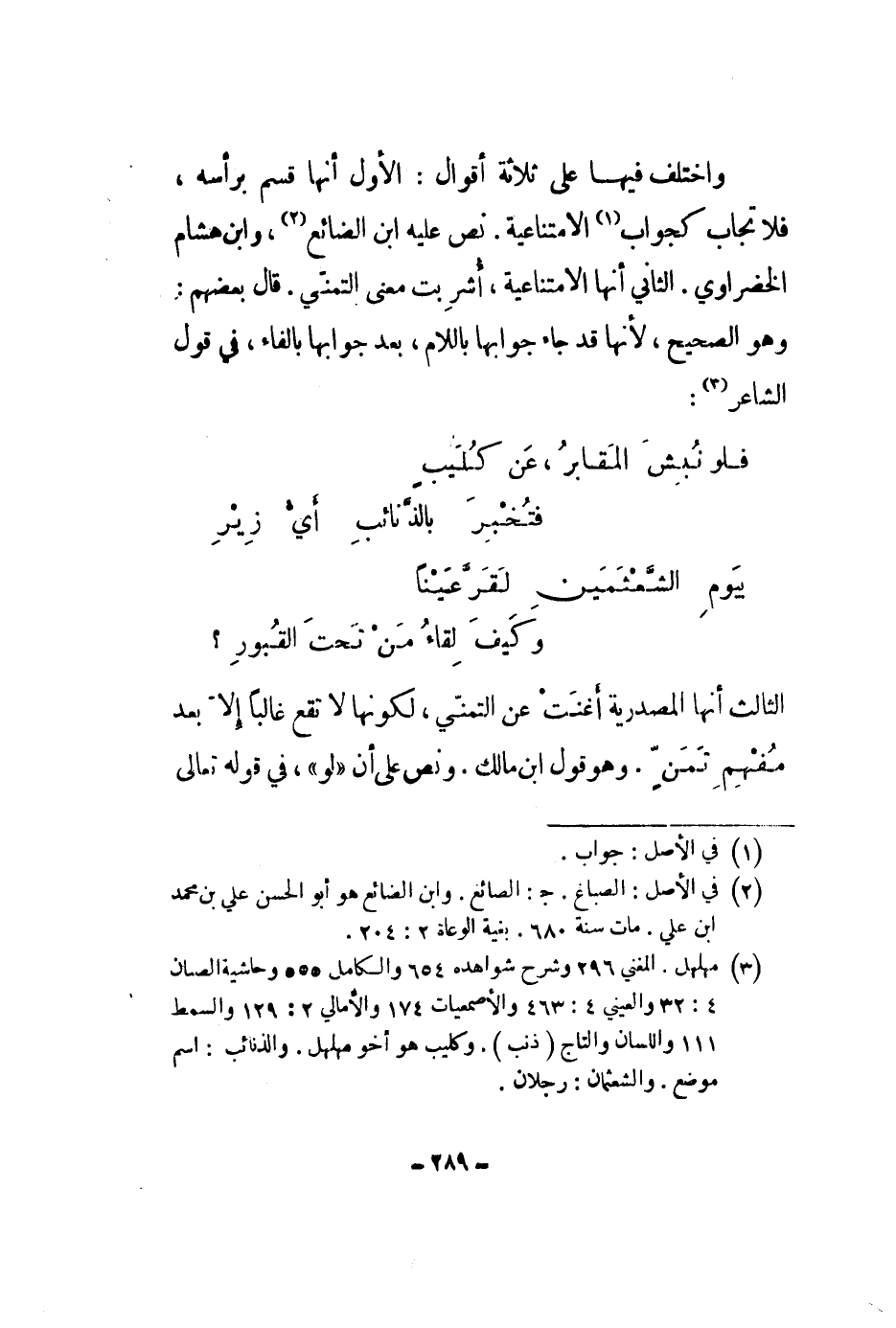 واختلف فيها على ثلاثة أقوال: الأول أنها قسم برأسه، فلا تجاب كجواب الامتنعية. نص عليه ابن الضائع، وابن هشام الخضراوي. الثاني أنها الامتناعية، أشربت معنى التمني. قال بعضهم: وهو الصحيح، لأنها قد جاء جوابها باللام، بعد جوابها بالفاء، في قول الشاعر:
