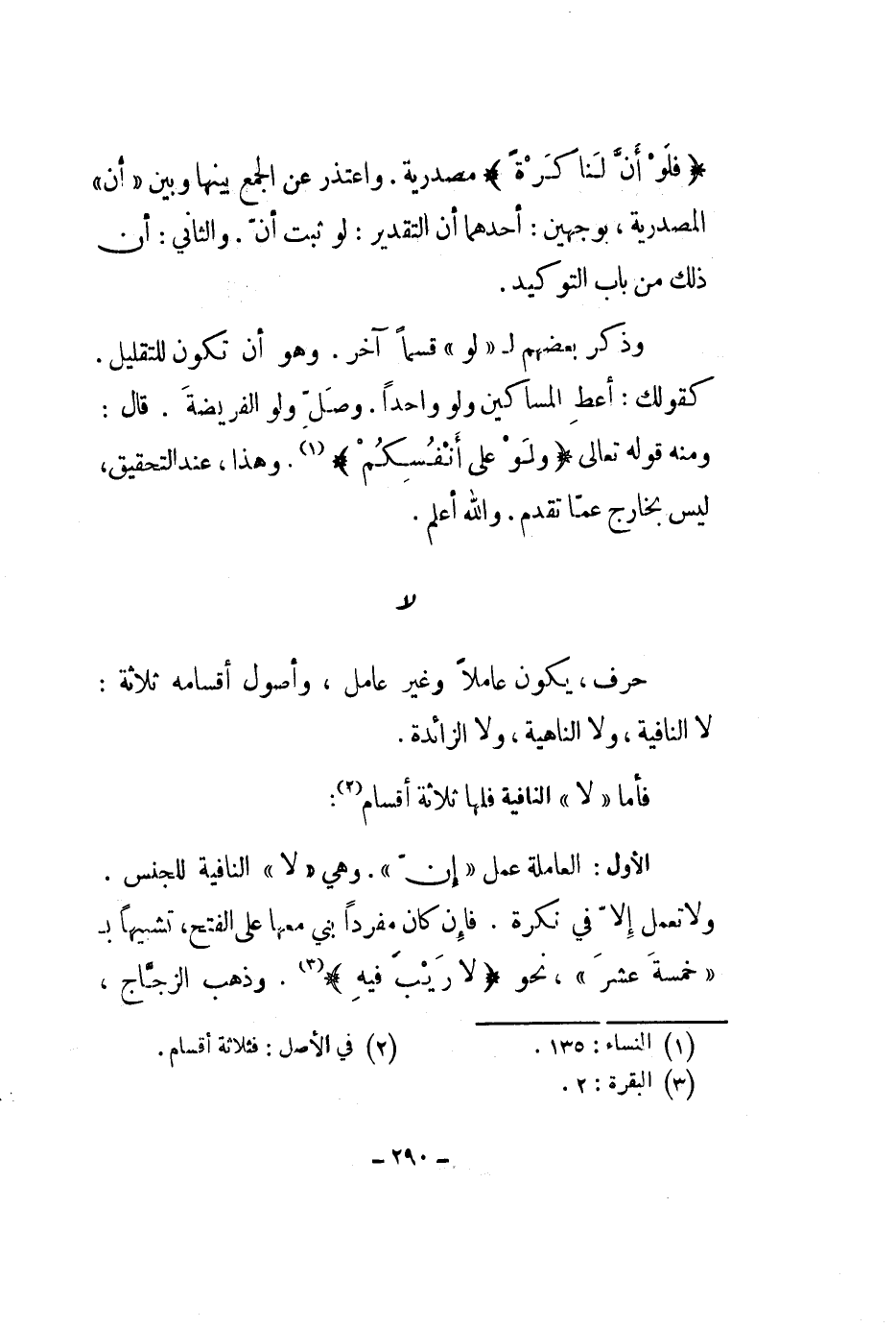 حرف، يكون عاملاً وغير عامل، وأصول أقسامه ثلاثة: لا النافية، ولا الناهية، ولا الزائدة.