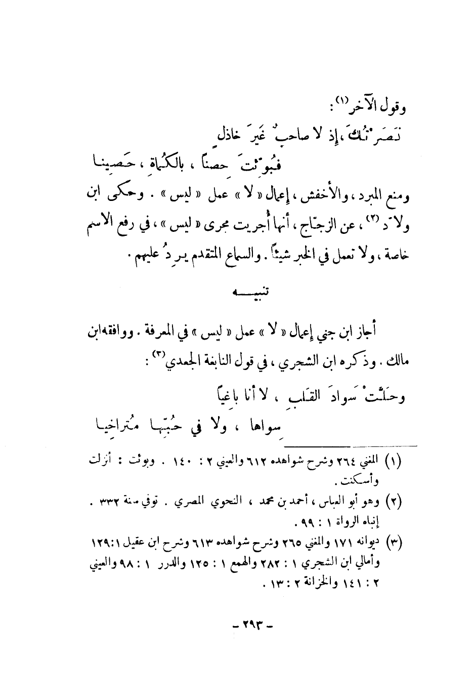 ومنع المبرد، والأخفش، إعمال لا عمل ليس. وحكى ابن ولاد، عن الزجاج، أنها أجريت مجرى ليس، في رفع الاسم خاصى، ولا تعمل في الخبر شيئاً. والسماع المتقدم يرد عليهم.