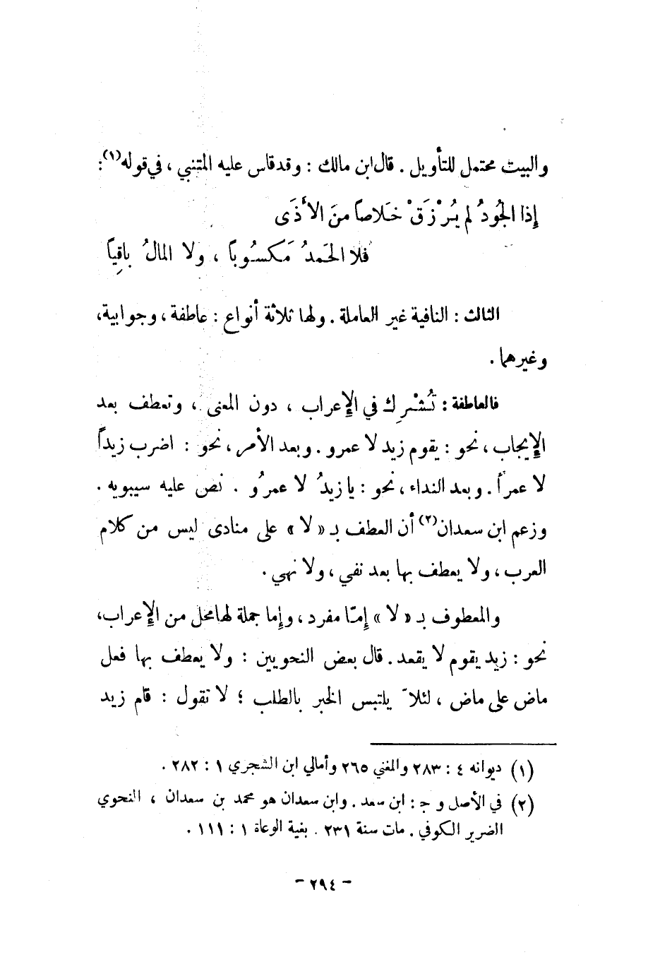 والمعطوف ب لا إما مفرد، وإما جملة لها محل من الإعراب، نحو: زيد يقوم لا يقعد. قال بعض النحويين: ولا يعطف بها فعل ماض على ماض، لئلا يلتبس الخبر بالطلب؛ لا تقول: قام زيد