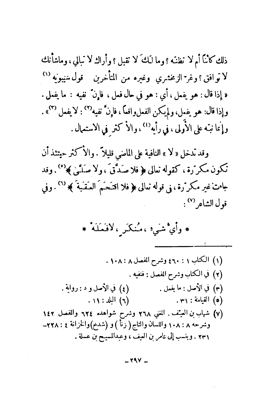وقد تدخل لا النافية على الماضي قليلاً. والأكثر حينئذ أن تكون مكررة، كقوله تعالى " فلا صدق، ولا صلى ". وقد جاءت غير مكررة، في قوله تعالى " فلا اقتحم العقبة ". وفي قول الشاعر: وأي شيء، منكر، لا فعله