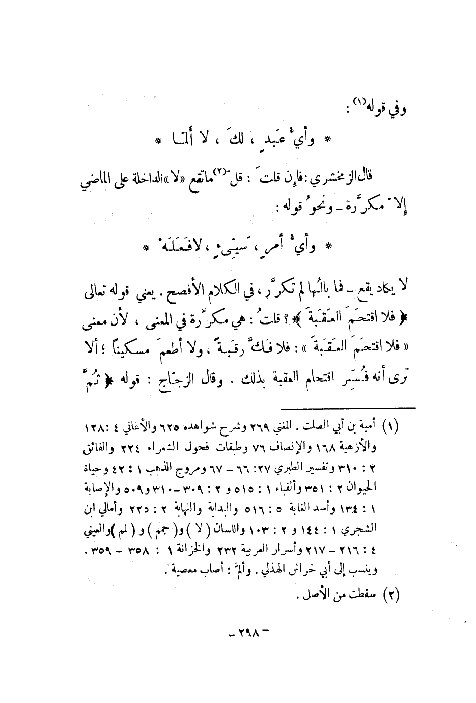 وفي قوله: وأي عبد، لك، لا ألما قال الزمخشري: فإن قلت: قل ما تقع لا الداخلة على الماضي إلا مكررة - ونحو قوله: وأي أمر، سيىء، لا فعله لا يكاد يقع - فما بالها لم تكرر، في الكلام الأفصح. يعني قوله تعالى " فلا اقتحم العقبة "؟ قلت: هي مكررة في المعنى، لأن معنى فلا اقتحم العقبة: فلا فك رقبة، ولا أطعم مسكيناً؛ ألا ترى أنه فسر اقتحام العقبة بذلك. وقال الزجاج: قوله " ثم