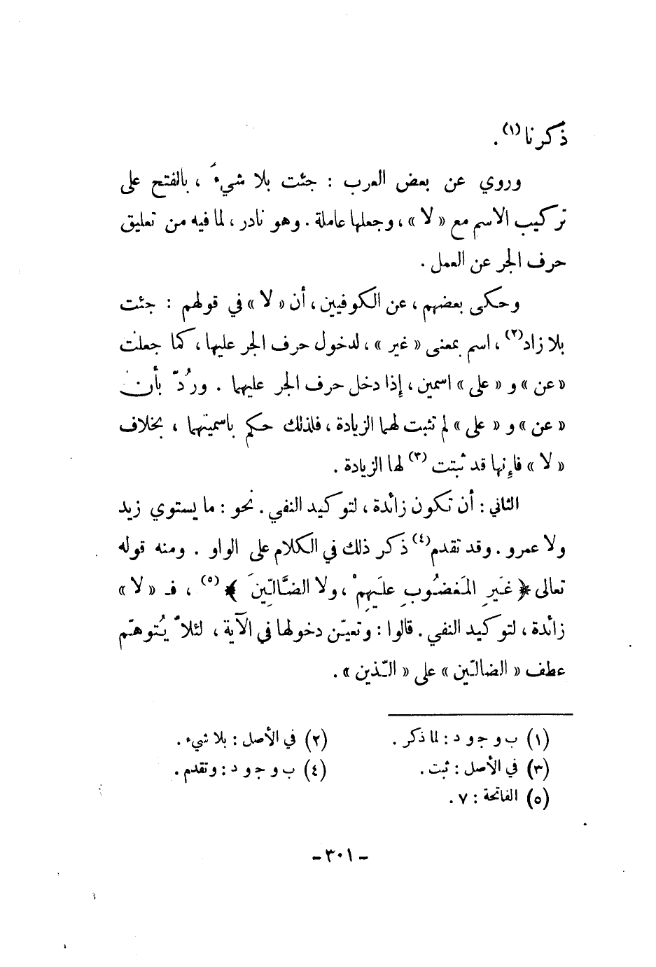 الثاني: أن تكون زائدة، لتوكيد النفي. نحو: ما يستوي زيد ولا عمرو. وقد تقدم ذكر ذلك في الكلام على الواو. ومنه قوله تعالى " غير المغضوب عليهم، ولا الضالين "، ف لا زائدة، لتوكيد النفي، قالوا: وتعين دخولها في الآية، لئلا يتوهم عطف الضالين على الذين.