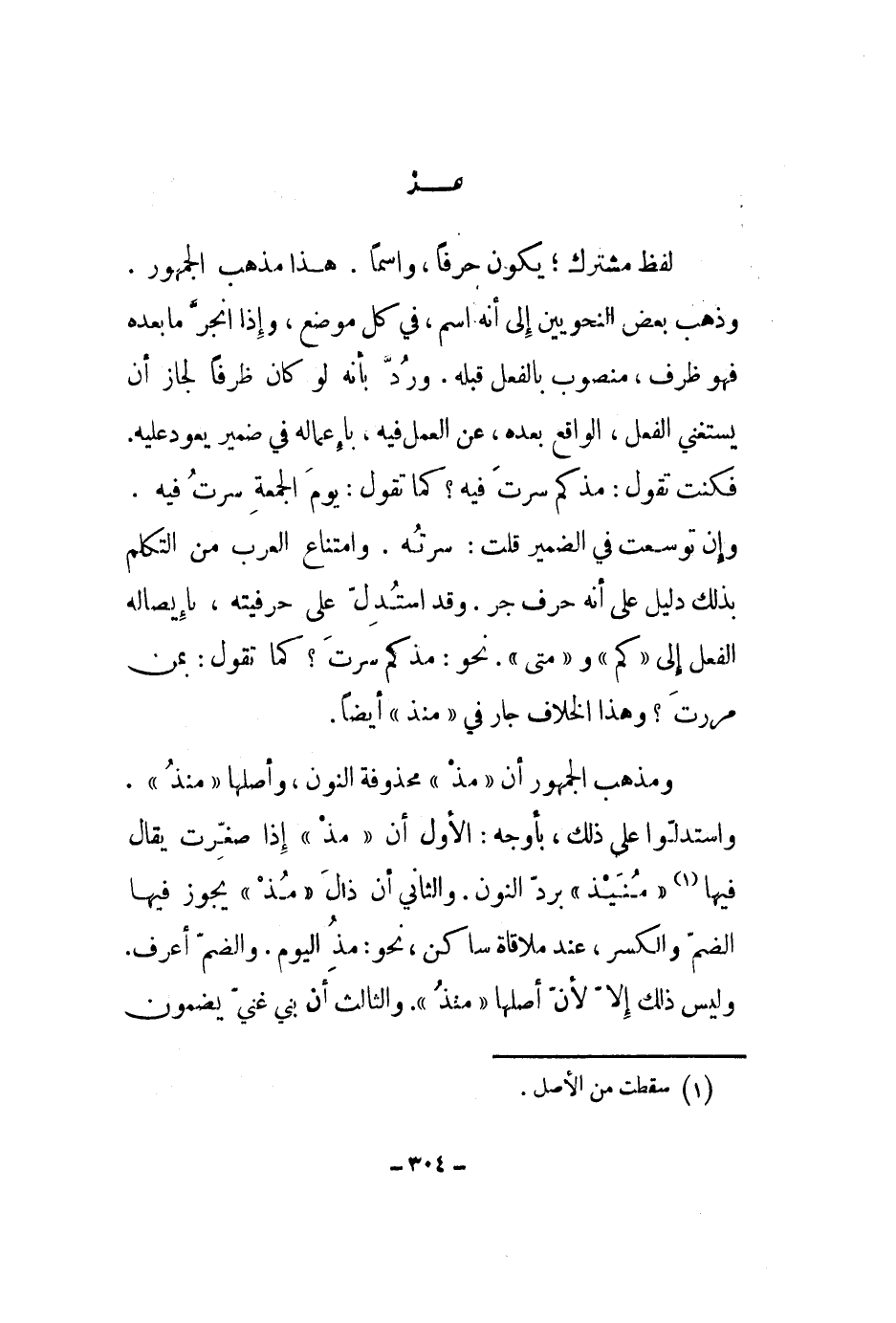 ومذهب الجمهور أن مذ محذوفة النون، وأصلها منذ. واستدلوا على ذلك، بأوجه: الأول أن مذ إذا صغرت يقال فيها منيذ برد النون. والثاني أن ذال مذ يجوز فيها الضم والكسر، عند ملاقالة ساكن، نحو: مذ اليوم. والضم أعرف. وليس ذلك إلا لأن أصلها منذ الثالث أن بني غني يضمون