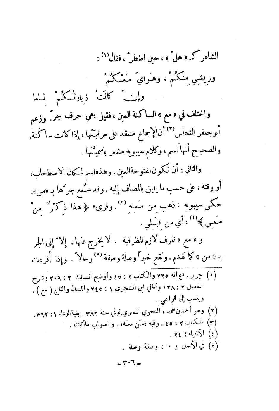 واختلف في مع الساكنة العين، فقيل: هي حرف جر. وزعم أبو جعفر النحاس أن الإجماع منعقد على حرفيتها، إذا كانت ساكنة. والصحيح أنها اسم، وكلام سيبويه مشعر باسميتها.