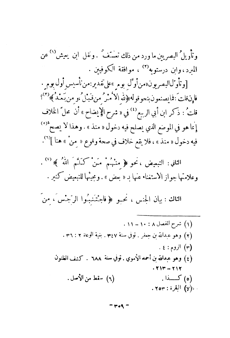 وتأول البصريون من أول يوم على تقدير: من تأسيس أول يوم. فإن قلت: فما يصنعون بنحو قوله " لله الأمر من قبل، ومن بعد "؟ قلت: ذكر ابن أبي الربيع في شرح الإيضاح أن محل الخلاف إنما هو في الموضع الذي يصلح فيه دخول منذ. وهذا لا يصح فيه دخول منذ، فلا يقع خلاف في صحة وقوع من هنا.