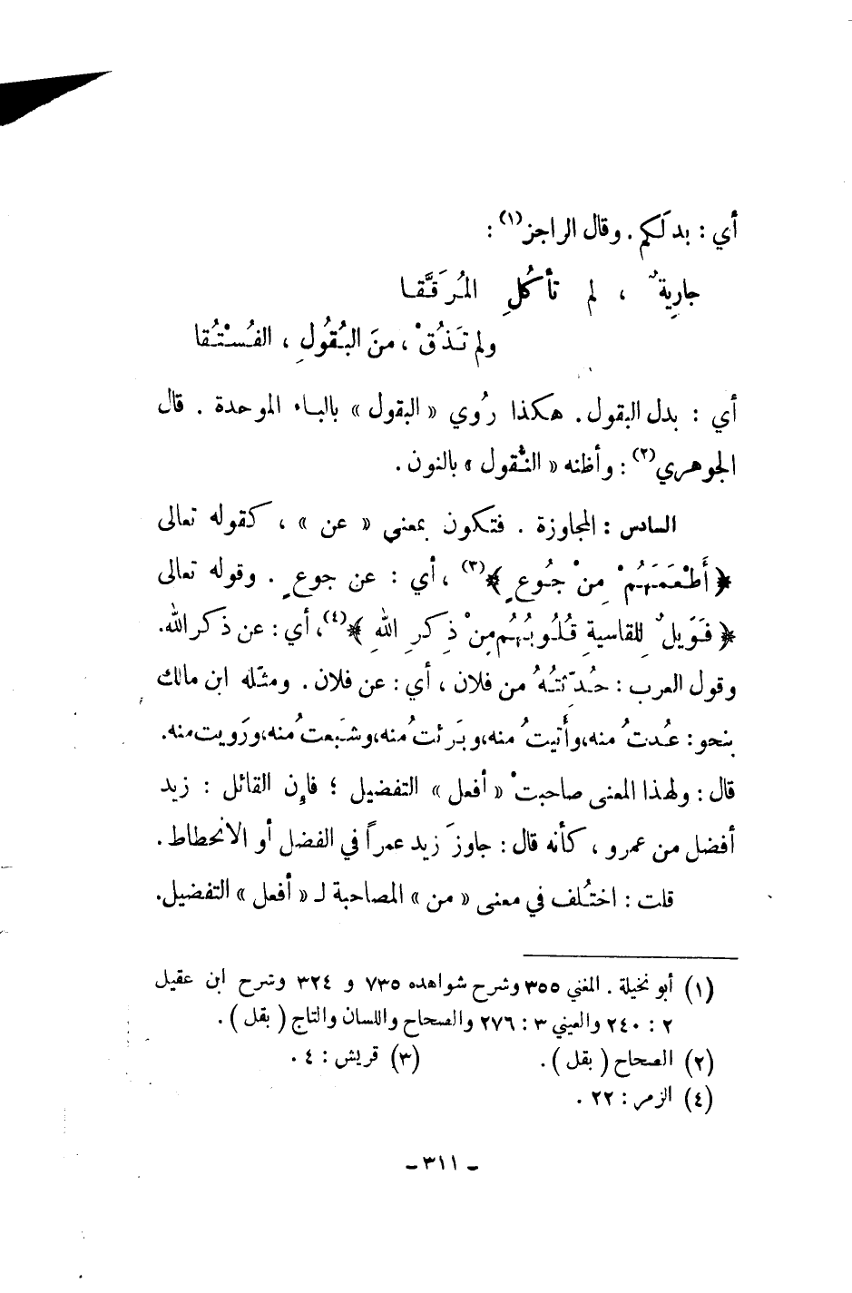 السادس: المجاوزة. فتكون بمعنى عن، كقوله تعالى " أطعمهم من جوع "، أي: عن جوع. وقوله تعالى " فويل للقاسية قلوبهم من ذكر الله "، أي: عن ذكر الله. وقول العرب: حدثته من فلان، أي: عن فلان. ومثله ابن مالك بنحو: عدت منه، وأتيت منه، وبرئت منه، وشبعت منه، ورويت منه. قال: ولهذا المعنى صاحبت أفعل التفضيل؛ فإن القائل: زيد أفضل من عمرو، كأنه قال: جاوز زيد عمراً في الفضل أو الانحطاط.